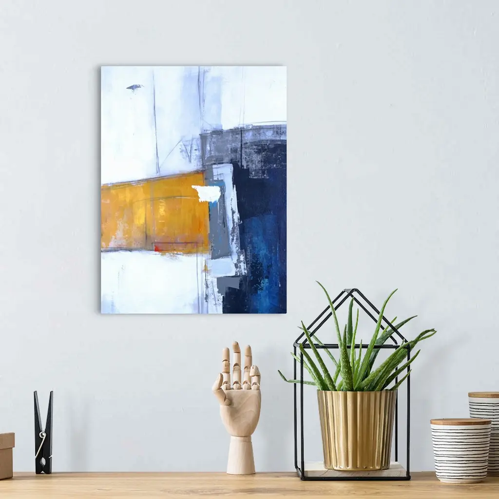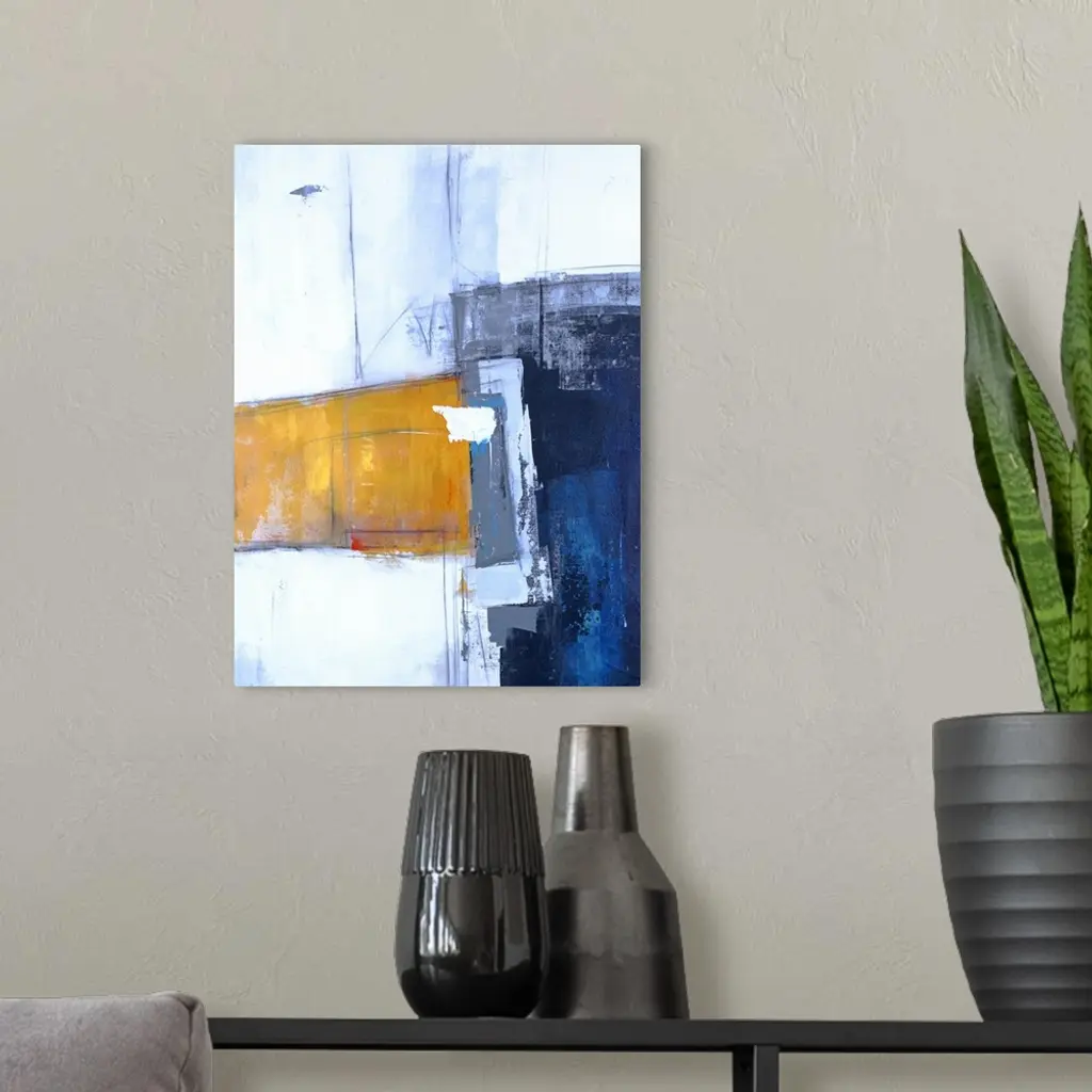Contemporary abstract painting with bold shapes in dark blue and yellow on a light blue background with thin lines.