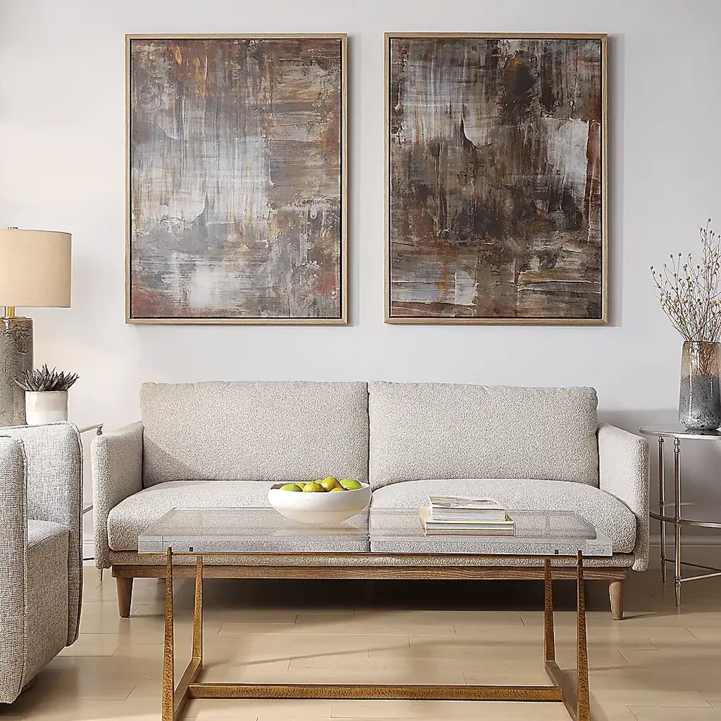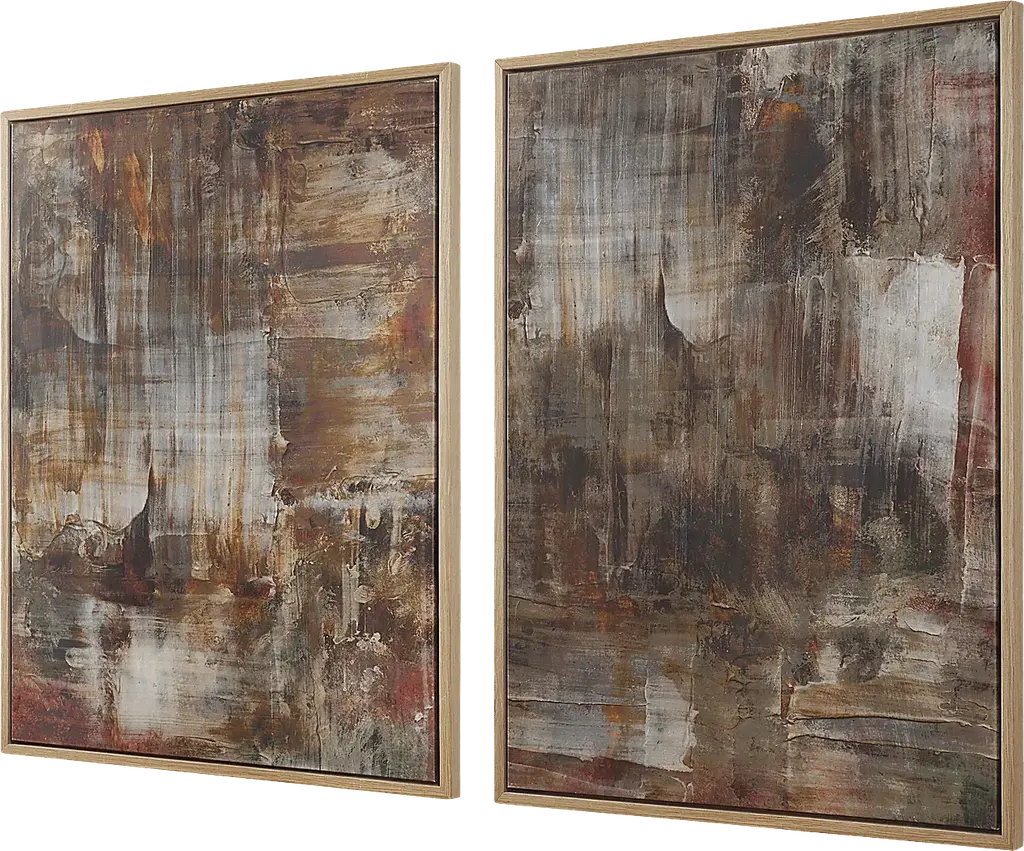 Featuring a captivating interplay of rich earth tones, dynamic brushstrokes, and abstract textures, Lokil giclee on canvas is surrounded by a solid wood frame in a warm, light oak finish.