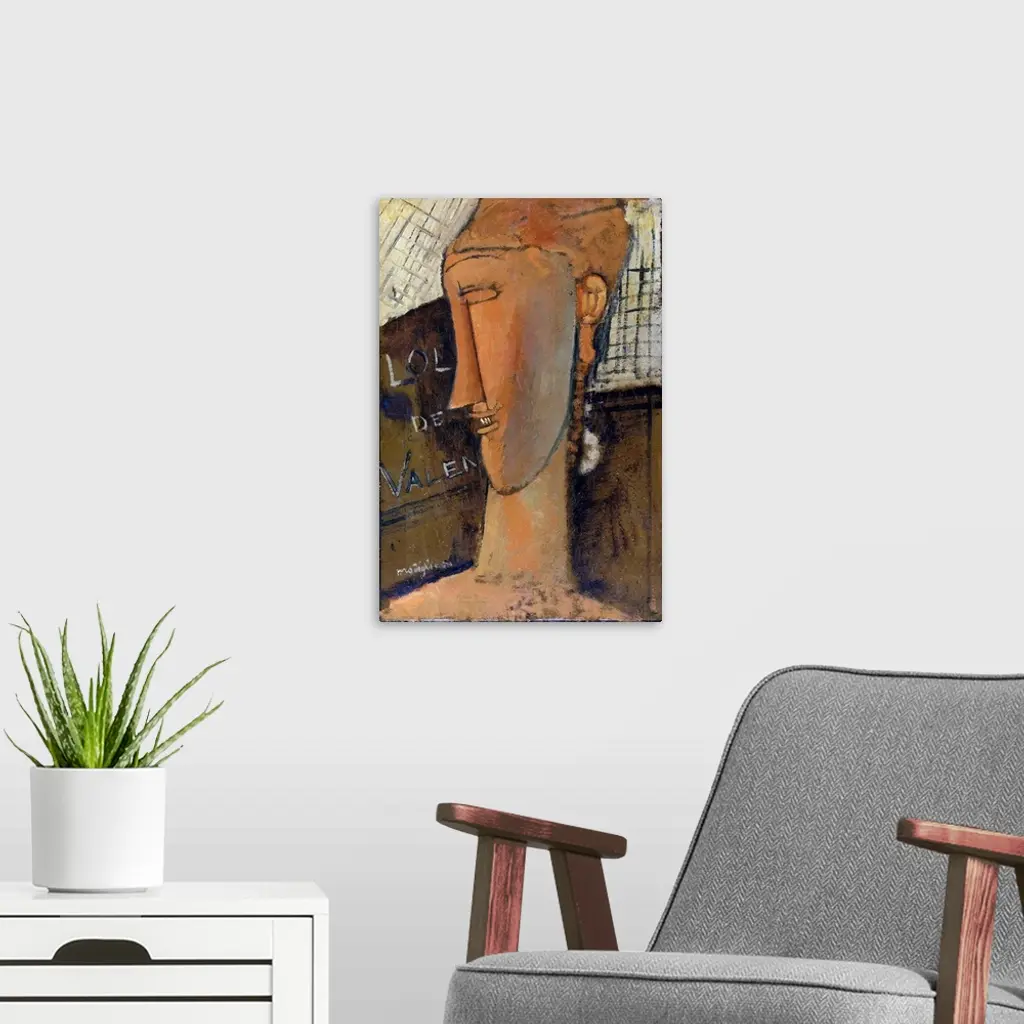Modigliani consistently integrated stylistic features of African art into his distinctive portraits. This work represents Lola de Valence, a famous dancer who had previously modeled for Edouard Manet. Recalling a type of mask made in the French Congo, the head's elongated shape and abstracted facial features also appear in Modigliani's limestone sculpture Woman's Head. Although the artist had abandoned sculpture to focus exclusively on painting by 1914, his African-inflected sculptural style was a touchstone for his painted portraits until his untimely death in 1920.