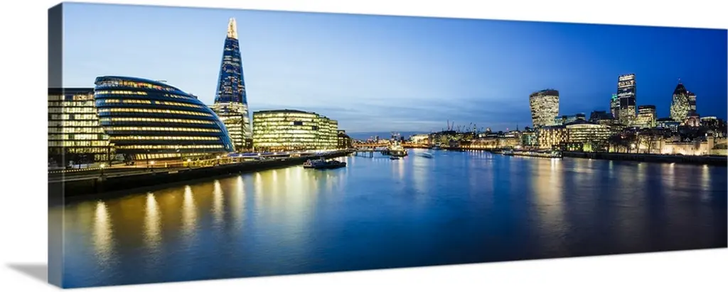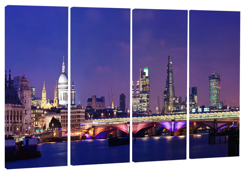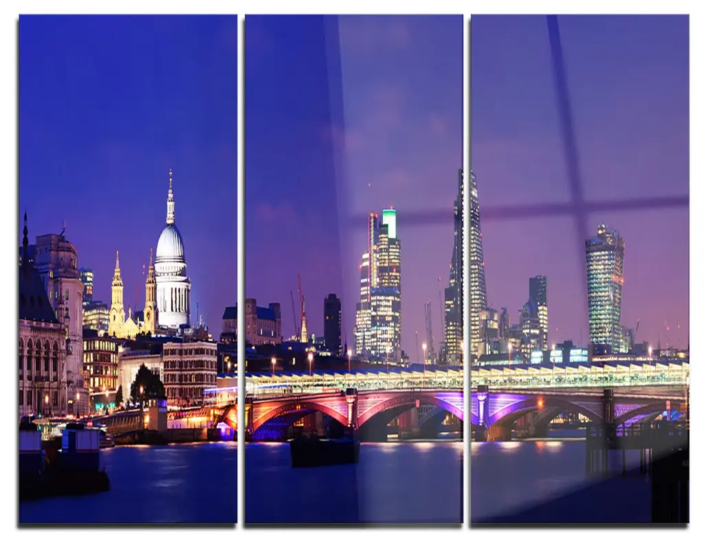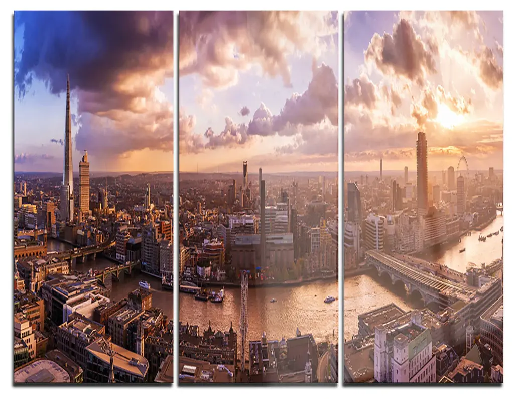 60"œ x 30"œ total size. Ready To Hang! (3 pieces - 20"œ x 30"œ each). 3 Panel Split (Triptych) Metal Print ft. London City Financial District Skyline in the evening. Modern metal wall art for home or office wall decor & interior design. Printed on Luxurious, HD aluminum glossy metal panels. Multi panel art.. HD aluminum panels. Metal print wall art. Includes Shadow Wall Mount on the back.• Aluminum Metal Wall Art• Made in USA• Ready to hang - No assembly required• Shadow mount hardware on the back• 0.045"œ thick HD Aluminum Panels• Scratch resistant, glossy finish• Superb color clarity, luxurious prints• Epson printing process• For indoor or moisture rich environment use• Easy to clean. Gently wipe with microfiber cloth.