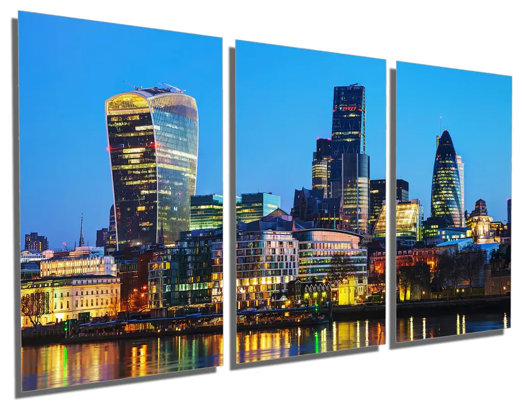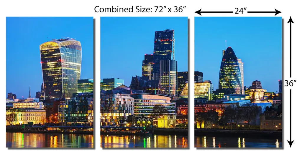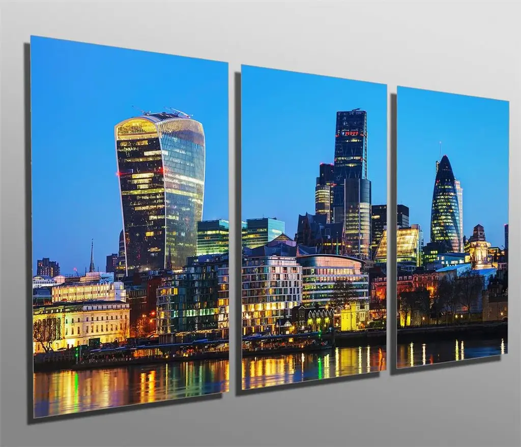 72"œ x 36"œ total size. Ready To Hang! (3 pieces - 24"œ x 36"œ each). 3 Panel Split (Triptych) Metal Print ft. London City Financial District Skyline in the evening. Modern metal wall art for home or office wall decor & interior design. Printed on Luxurious, HD aluminum glossy metal panels. Multi panel art.. HD aluminum panels. Metal print wall art. Includes Shadow Wall Mount on the back.• Aluminum Metal Wall Art• Made in USA• Ready to hang - No assembly required• Shadow mount hardware on the back• 0.045"œ thick HD Aluminum Panels• Scratch resistant, glossy finish• Superb color clarity, luxurious prints• Epson printing process• For indoor or moisture rich environment use• Easy to clean. Gently wipe with microfiber cloth.