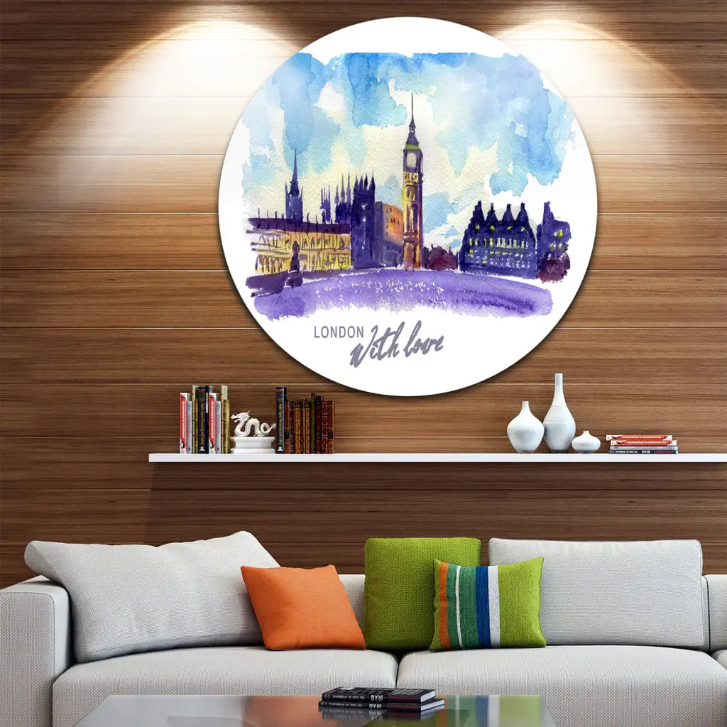London Purple Illustration, Cityscape Painting Round Wall Art, 36"