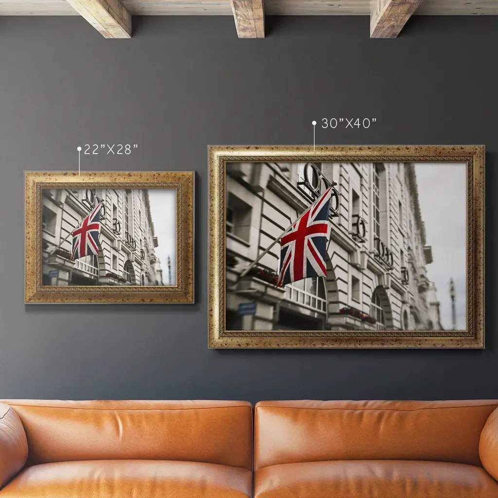 London Scene II Premium Framed Canvas- Ready to Hang A Premium Framed Canvas created to last. Framed in distressed wood and available in an array of sizes and colors Featuring a beveled a solid wood stretcher bar, each piece comes ready to hand 3 SIZES AVAILABLE 16''X20'' - Overall Size 18'X27'' - Overall Size 24''x36'' - Overall Size Each piece is made to order. Each piece comes with hanging hardware. Made in the USA Ready to Hang Giclee Paper Print Acrylic Glass Beveled Matt Board