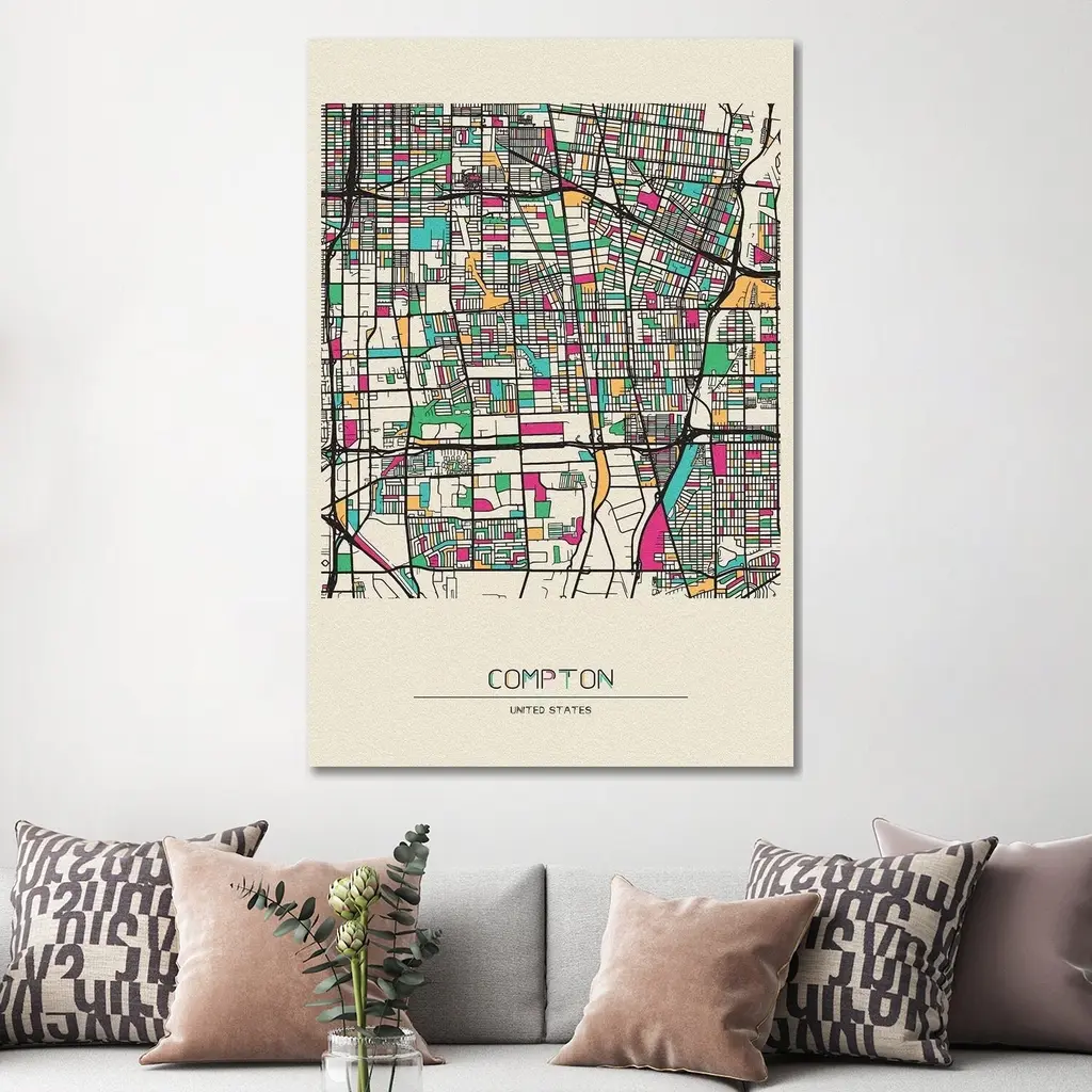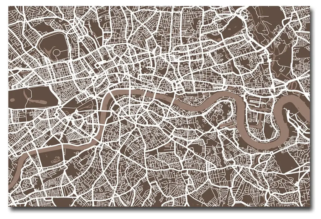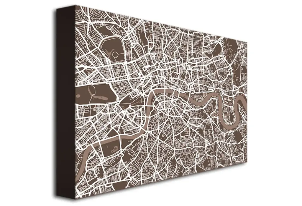 Title: London Street Map IIArtist: Michael TompsettProduct Type: Canvas ArtSize: 16" x 24"Made in the USA.Art and design were always Michael's favorite subjects at school. He was fortunate to land a job as a graphic designer at one of London's most prestigious publishing companies. After 12 years Michael Tompsett made the decision to pursue a full-time career creating his own work. The freedom and time to be able to focus solely on his own projects has been a wonderful experience. Although Michael likes to experiment with different styles and subjects, his main focus is on map art. He enjoys looking for unique and interesting ways to depict something familiar. Maps are visual representations of the world we live in, a world which is incredibly diverse. Apart from maps, Tompsett creates urban landmark and cityscape designs.This 16" x 24" canvas art is ready to hang. Giclee (jee-clay) is an advanced printmaking process for creating high quality fine art reproductions. The attainable excellence that Giclee printmaking affords makes the reproduction virtually indistinguishable from the original piece. The result is wide acceptance of Giclee by galleries, museums, and private collectors. Gallery wrap is a method of stretching an artist's canvas so that the canvas wraps around the sides and is secured to a hidden, wooden frame. This method of stretching and preparing a canvas allows for a frameless presentation of the finished print.