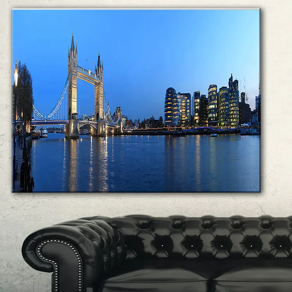 The London Tower Bridge in Blue canvas art print is sure to make an impression on anyone who sees it. This artwork is gallery wrapped around a 1-inch solid wood frame and arrives carefully packaged and entirely ready to hang on the wall. Design Art only uses the highest resolution and pigments to ensure a crisp colorful print that is never faded or pixelated. This artwork is sure to be a conversation starter in any home or office.