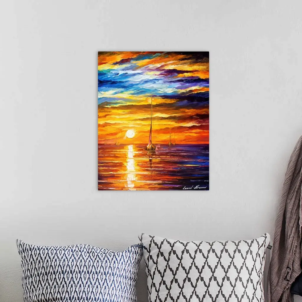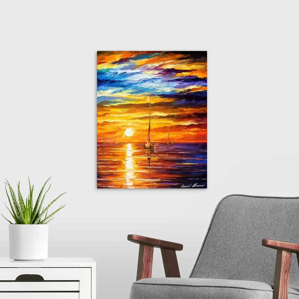Contemporary colorful painting of the sun setting over a calm seascape.