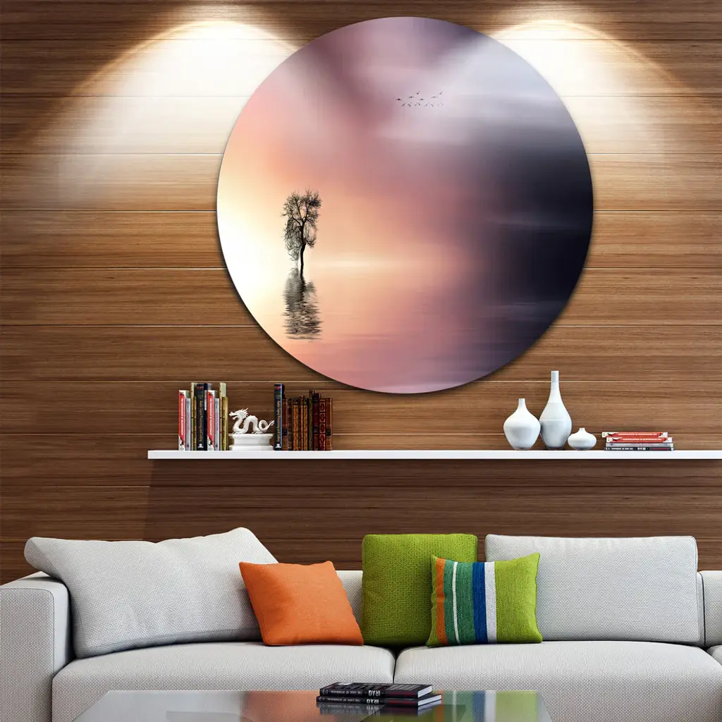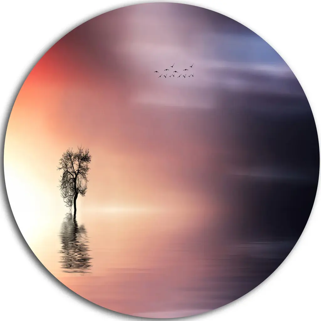 Lonely Tree And Birds Panorama, Round Metal Wall Art Landscape, 23"