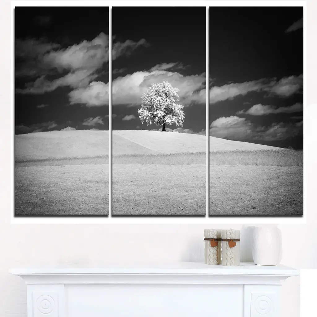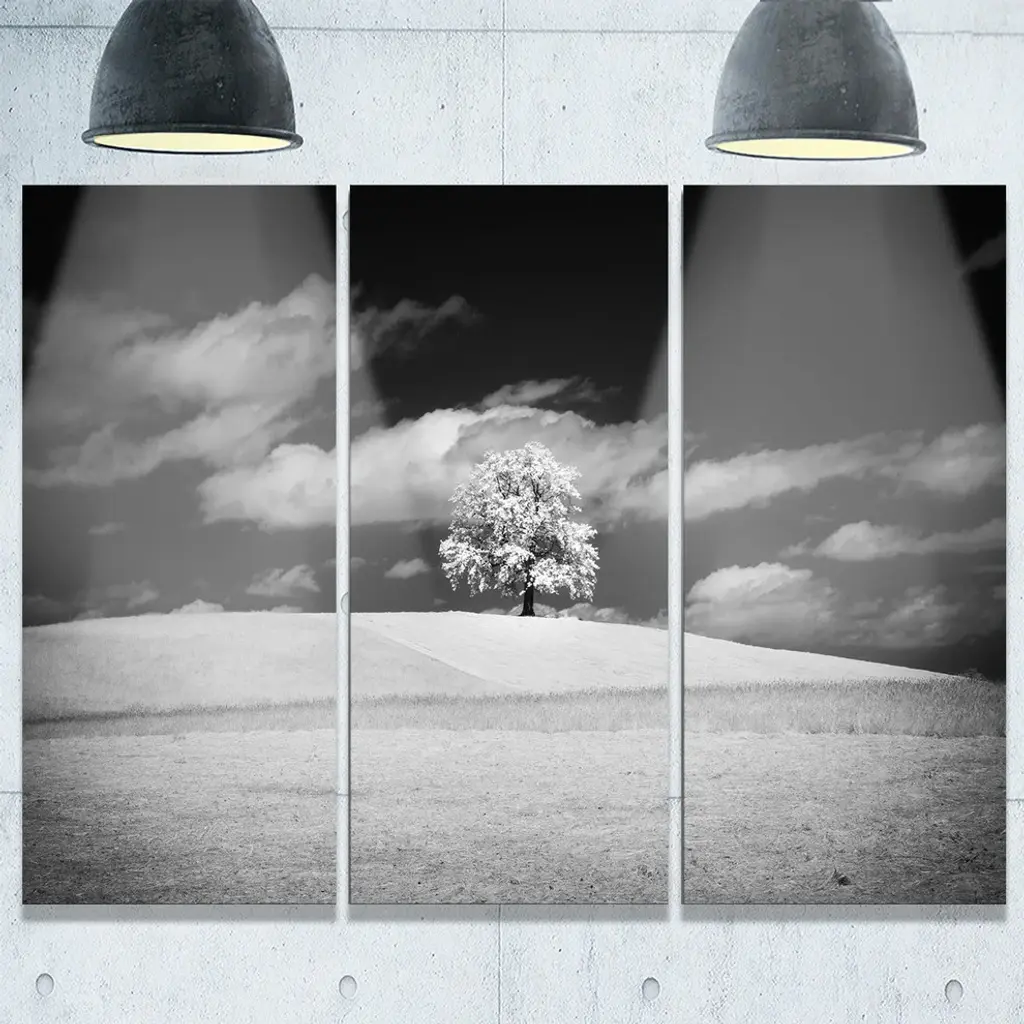 "Lonely Tree On Meadow Black White" Metal Wall Art, 3 Panels, 36"x28"