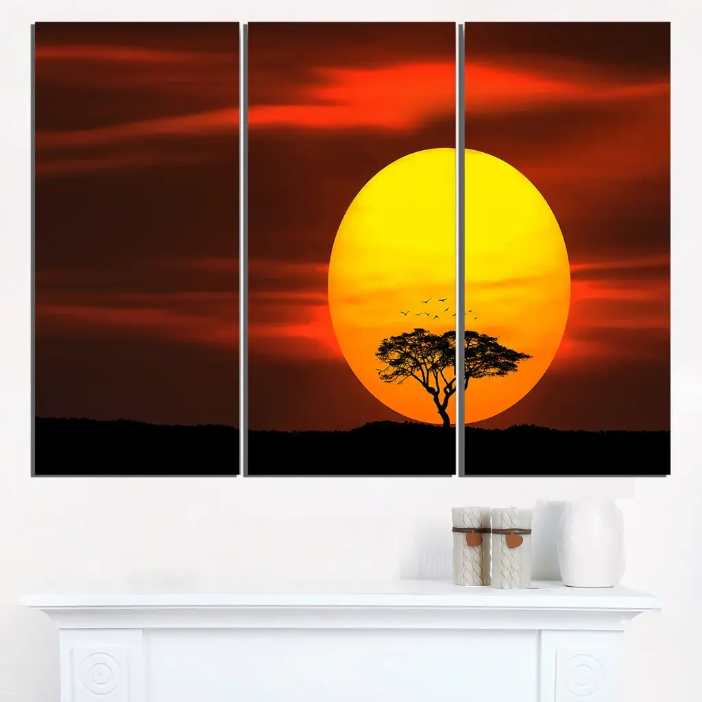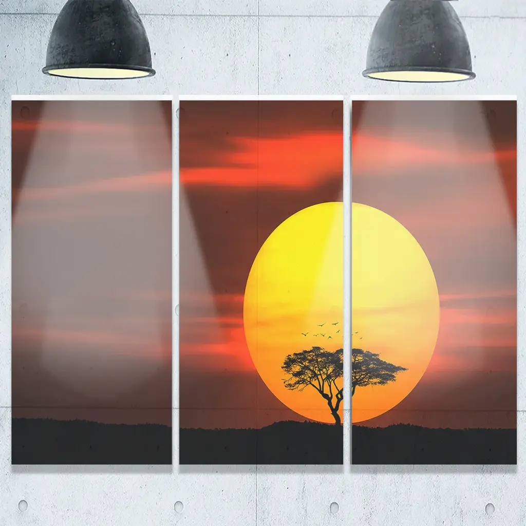 "Lonely Tree With Birds At Sunset" Metal Landscape, 3 Panels, 36"x28"