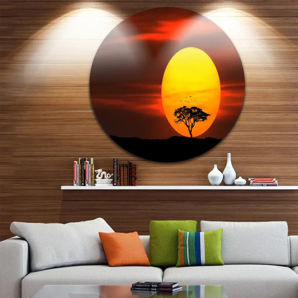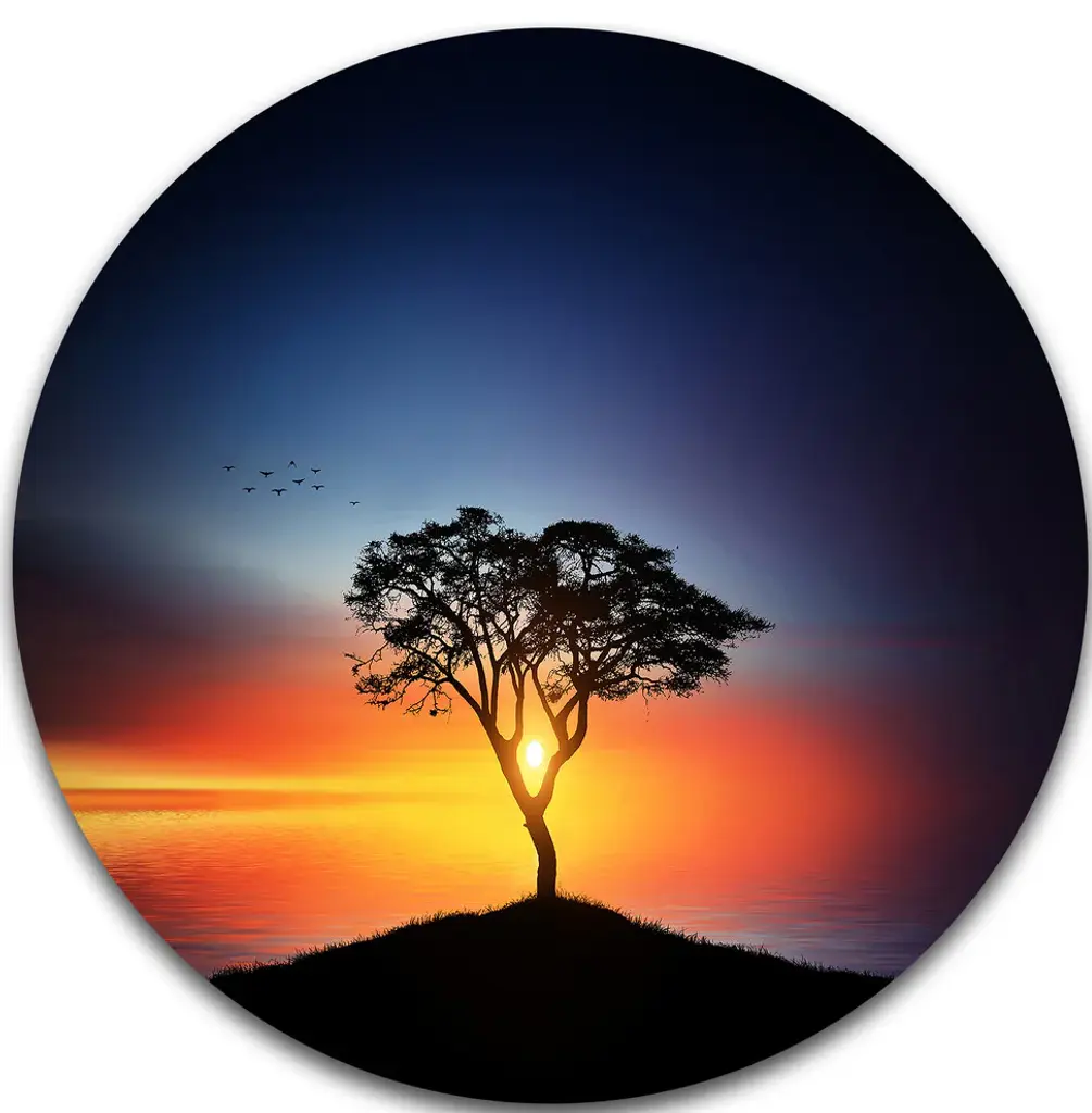 Bring Contemporary Abstraction to your home with this large Circle Metal wall art. This Lonely Tree with Birds at Sunset Metal Artwork makes it the focal point of any room or office. - White Gloss Coating ensures colors are extra vibrant with light reflection.- Aluminum grade Sheet Metal with 1 inch mounting frame on the back giving the illusion that the artwork is floating on the wall..- Mounting Brackets are included along with instructions.- High Quality Digital images are created directly into a glossy aluminum panel producing a stunning and captivating print into the glossy finish of the metal.- Water, Fire and Scratch resistant HD Aluminum panels.- Looks better than any photo paper and guaranteed to last at least 20 years- Easy to clean with a microfiber cloth. Colors are far superior to regular Canvas Art. - Easy to Hang