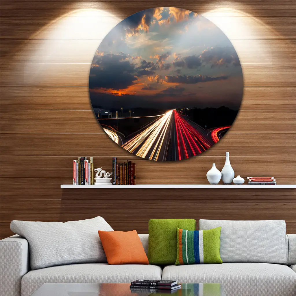Long Exposure Traffic, Abstract Digital Art Round Metal Wall Art, 11"