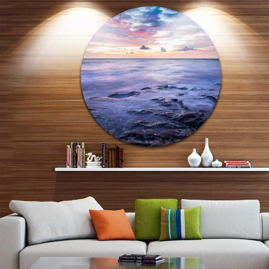 Bring Contemporary Abstraction to your home with this large Circle Metal wall art. This Long Exposure Twilight Sea Rocks Metal Artwork makes it the focal point of any room or office. - White Gloss Coating ensures colors are extra vibrant with light reflection.- Aluminum grade Sheet Metal with 1 inch mounting frame on the back giving the illusion that the artwork is floating on the wall..- Mounting Brackets are included along with instructions.- High Quality Digital images are created directly into a glossy aluminum panel producing a stunning and captivating print into the glossy finish of the metal.- Water, Fire and Scratch resistant HD Aluminum panels.- Looks better than any photo paper and guaranteed to last at least 20 years- Easy to clean with a microfiber cloth. Colors are far superior to regular Canvas Art. - Easy to Hang
