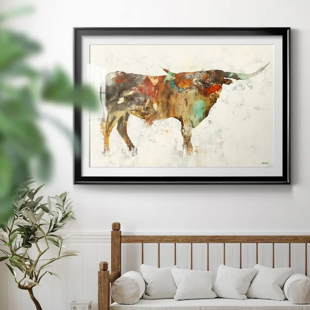 Long Horn Premium Framed Print - Ready to Hang A Premium Framed Print created to last. Framed in distressed wood and available in an array of sizes and colors Featuring a beveled a solid wood stretcher bar, each piece comes ready to hand 4 SIZES AVAILABLE 30.5''X42.5'' - Overall Size 26.5'X36.5'' - Overall Size 22''x30'' - Overall Size 18''x24'' - Overall Size Each piece is made to order. Each piece comes with hanging hardware. Made in the USA Ready to Hang Giclee Paper Print Acrylic Glass Beveled Matt Board