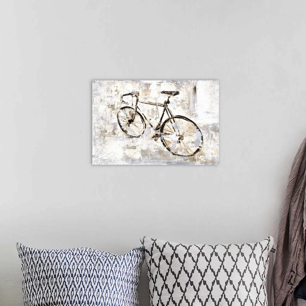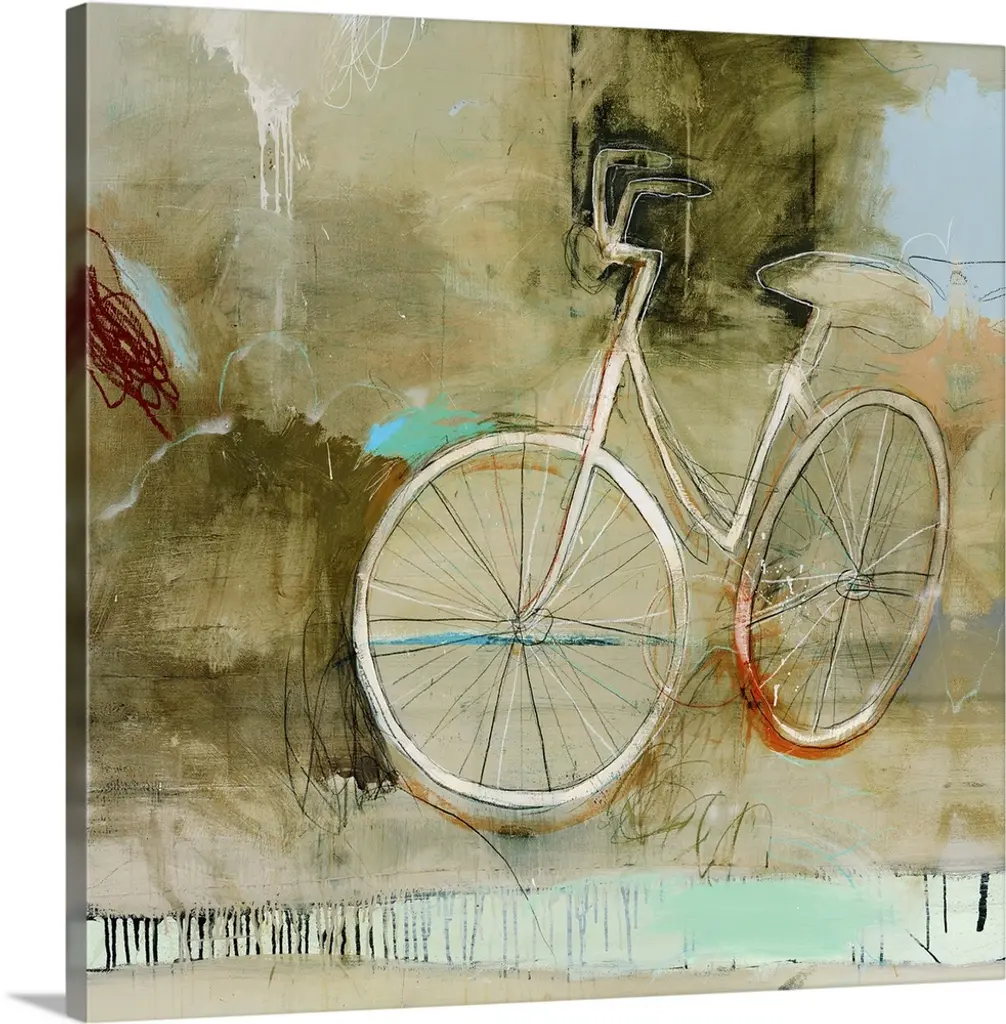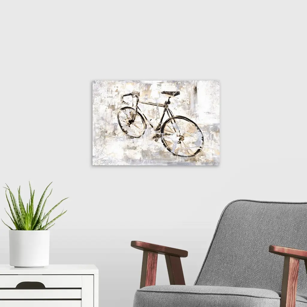Contemporary painting of a bicycle against a background of muted neutral tones.