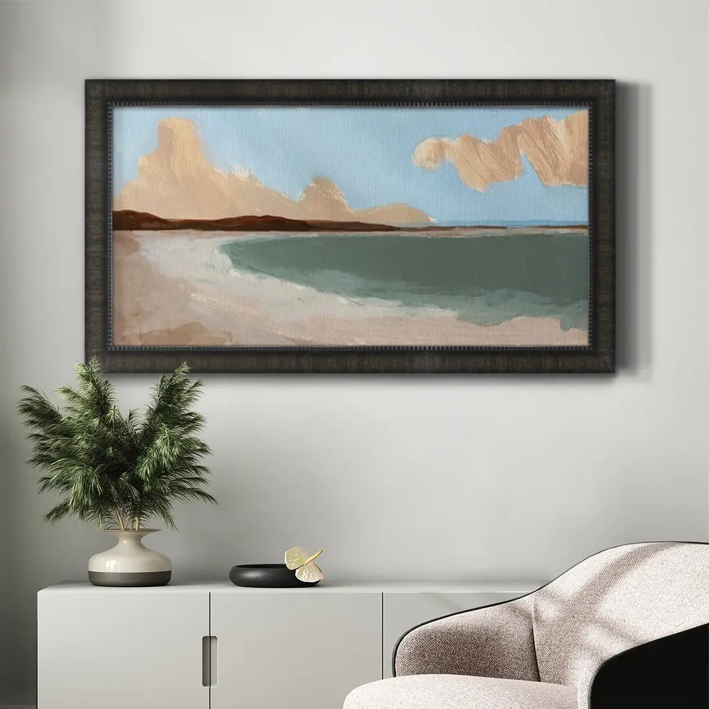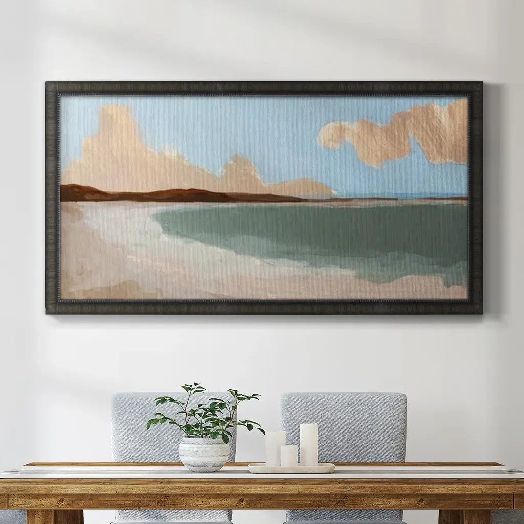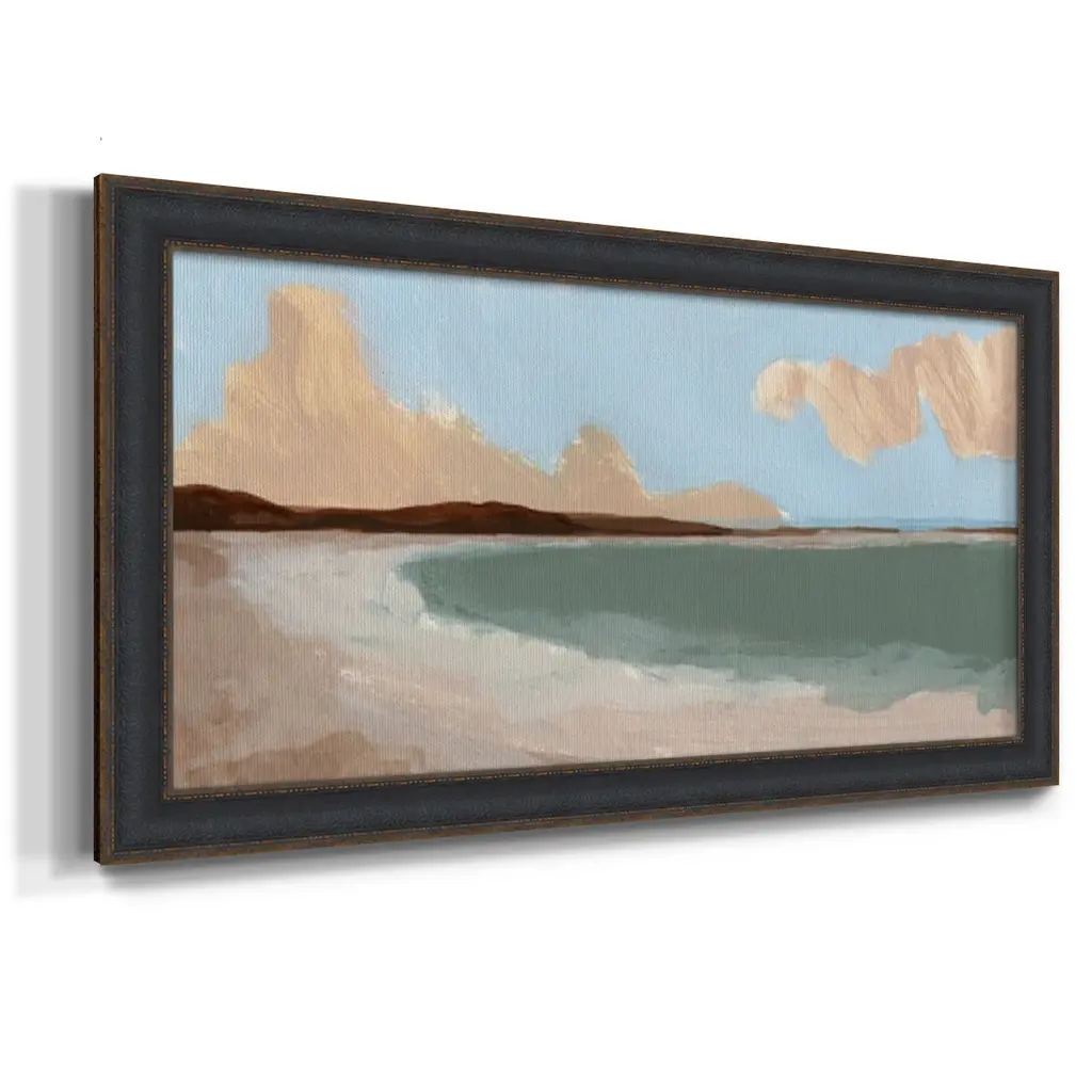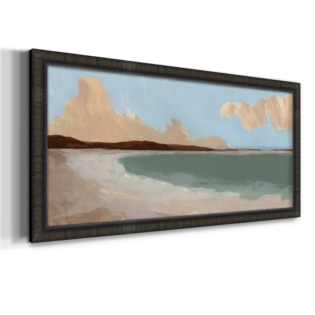 Long Shore I Premium Framed Canvas- Ready to Hang A Premium Framed Canvas created to last. Framed in distressed wood and available in an array of sizes and colors Featuring a beveled a solid wood stretcher bar, each piece comes ready to hand 3 SIZES AVAILABLE 21''X37'' - Overall Size 25''X45'' - Overall Size 29''x53'' - Overall Size Each piece is made to order. Each piece comes with hanging hardware. Made in the USA Ready to Hang Giclee Paper Print Acrylic Glass Beveled Matt Board