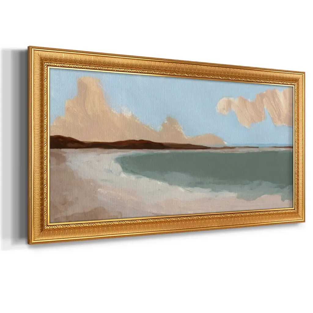 Long Shore I Premium Framed Canvas- Ready to Hang A Premium Framed Canvas created to last. Framed in distressed wood and available in an array of sizes and colors Featuring a beveled a solid wood stretcher bar, each piece comes ready to hand 3 SIZES AVAILABLE 21''X37'' - Overall Size 25''X45'' - Overall Size 29''x53'' - Overall Size Each piece is made to order. Each piece comes with hanging hardware. Made in the USA Ready to Hang Giclee Paper Print Acrylic Glass Beveled Matt Board