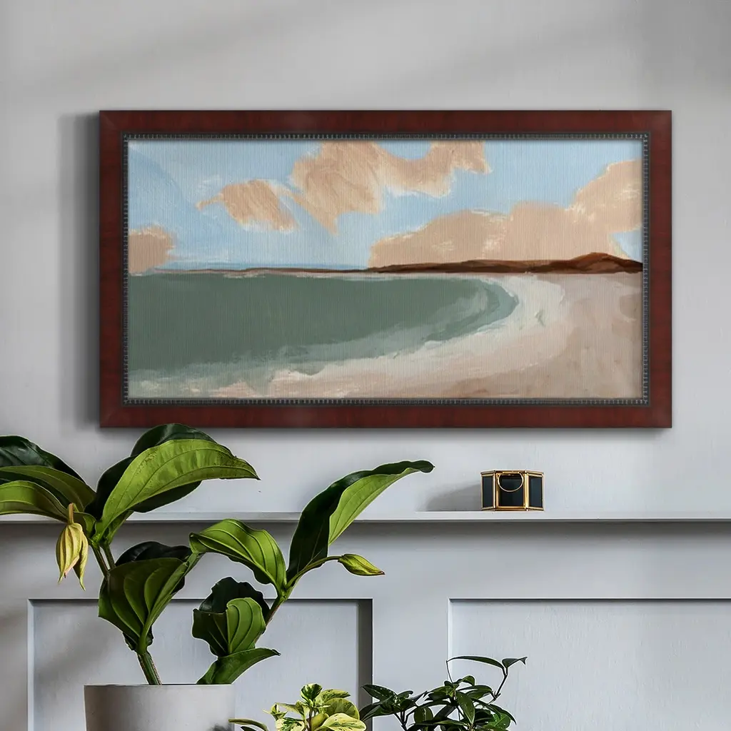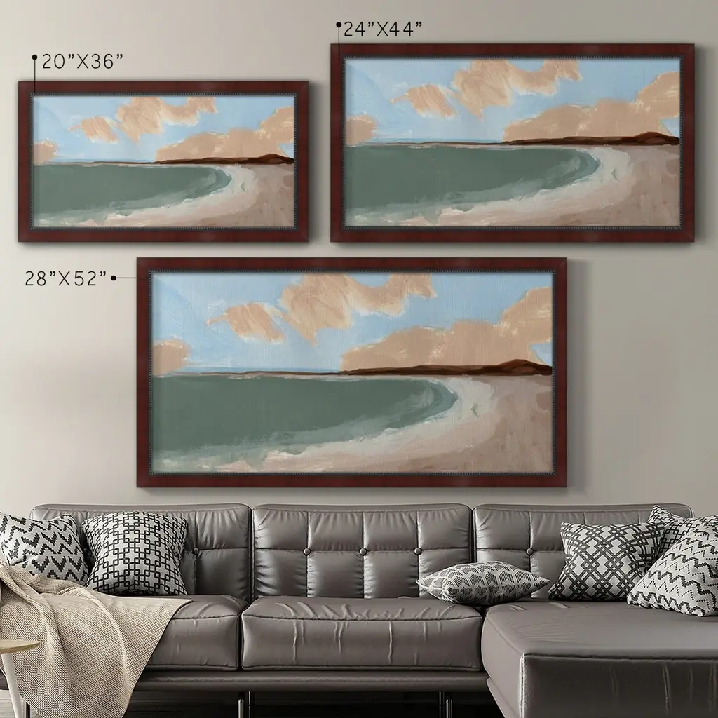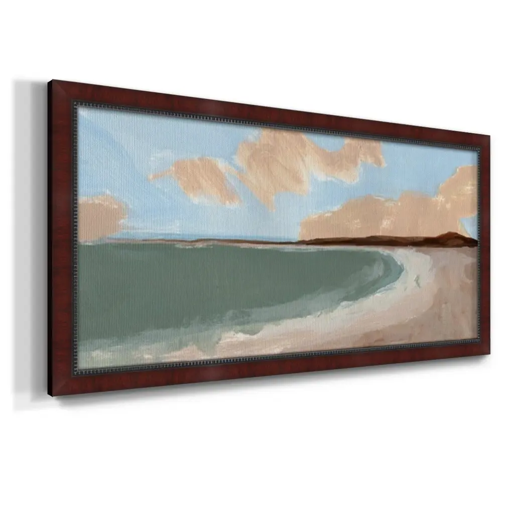 Long Shore II Premium Framed Canvas- Ready to Hang A Premium Framed Canvas created to last. Framed in distressed wood and available in an array of sizes and colors Featuring a beveled a solid wood stretcher bar, each piece comes ready to hand 3 SIZES AVAILABLE 21''X37'' - Overall Size 25''X45'' - Overall Size 29''x53'' - Overall Size Each piece is made to order. Each piece comes with hanging hardware. Made in the USA Ready to Hang Giclee Paper Print Acrylic Glass Beveled Matt Board