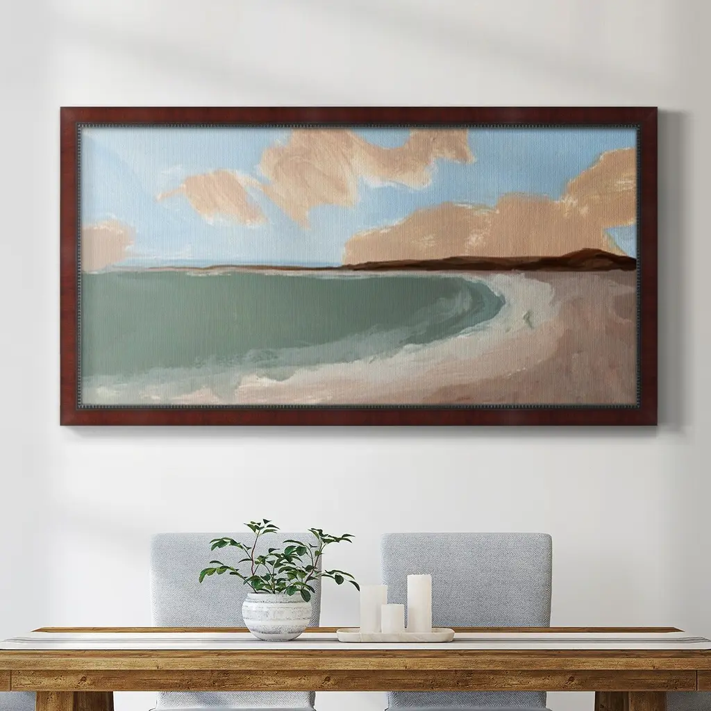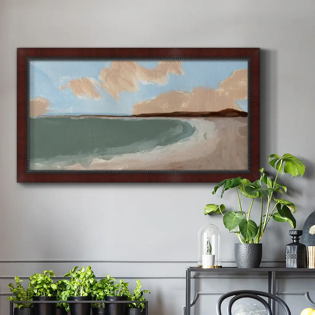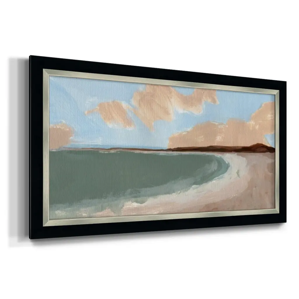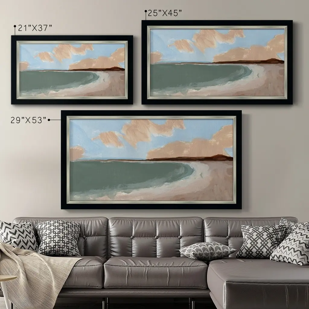 Long Shore II Premium Framed Canvas- Ready to Hang A Premium Framed Canvas created to last. Framed in distressed wood and available in an array of sizes and colors Featuring a beveled a solid wood stretcher bar, each piece comes ready to hand 3 SIZES AVAILABLE 21''X37'' - Overall Size 25''X45'' - Overall Size 29''x53'' - Overall Size Each piece is made to order. Each piece comes with hanging hardware. Made in the USA Ready to Hang Giclee Paper Print Acrylic Glass Beveled Matt Board