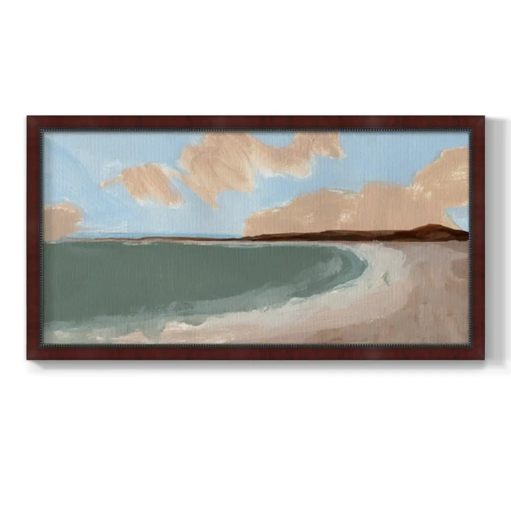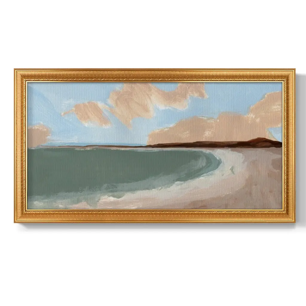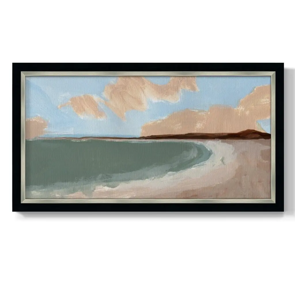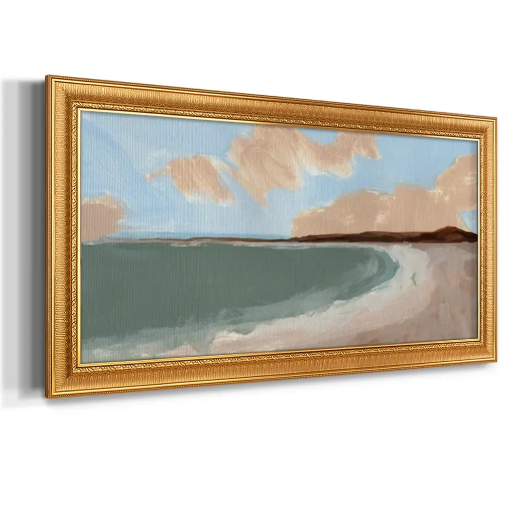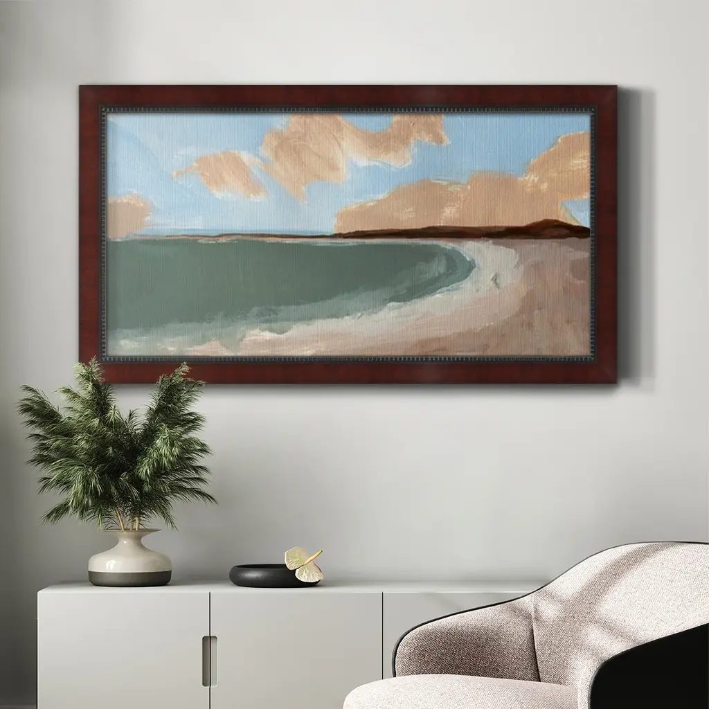 Long Shore II Premium Framed Canvas- Ready to Hang A Premium Framed Canvas created to last. Framed in distressed wood and available in an array of sizes and colors Featuring a beveled a solid wood stretcher bar, each piece comes ready to hand 3 SIZES AVAILABLE 21''X37'' - Overall Size 25''X45'' - Overall Size 29''x53'' - Overall Size Each piece is made to order. Each piece comes with hanging hardware. Made in the USA Ready to Hang Giclee Paper Print Acrylic Glass Beveled Matt Board