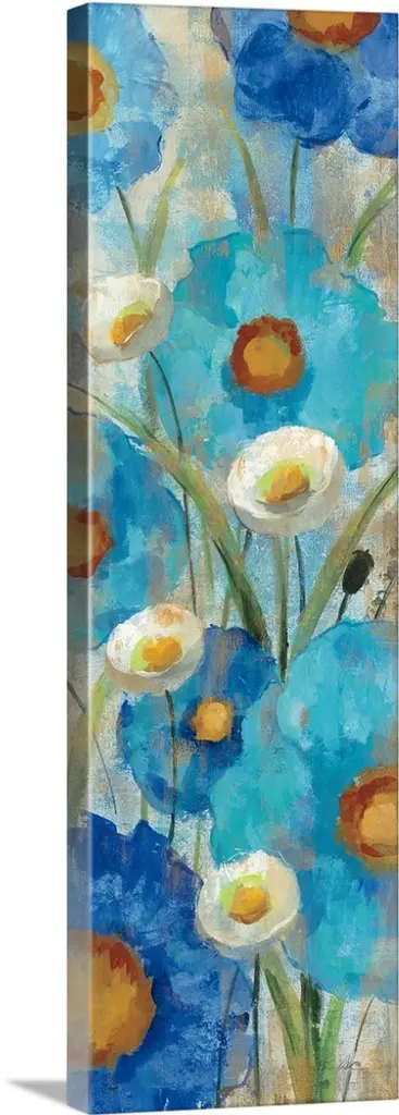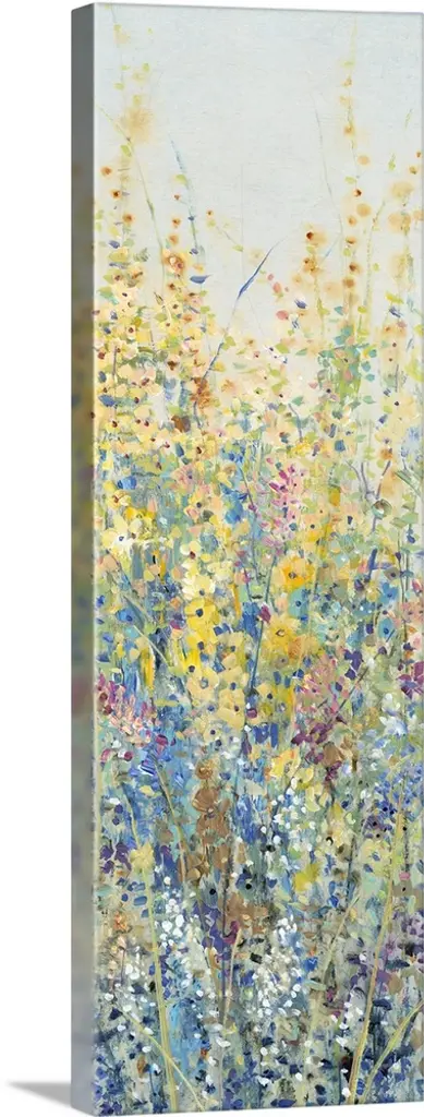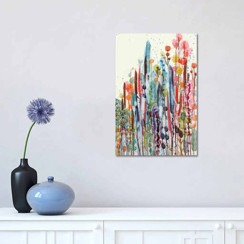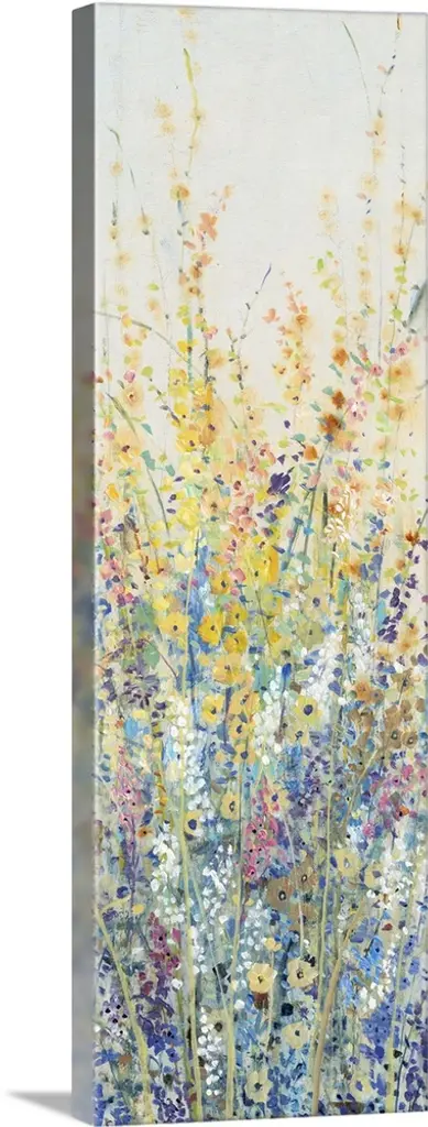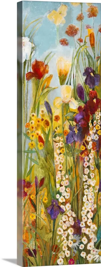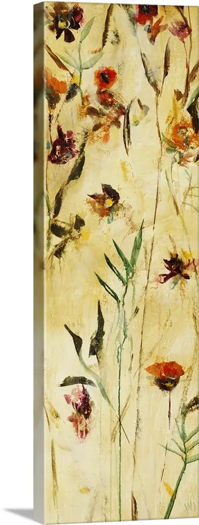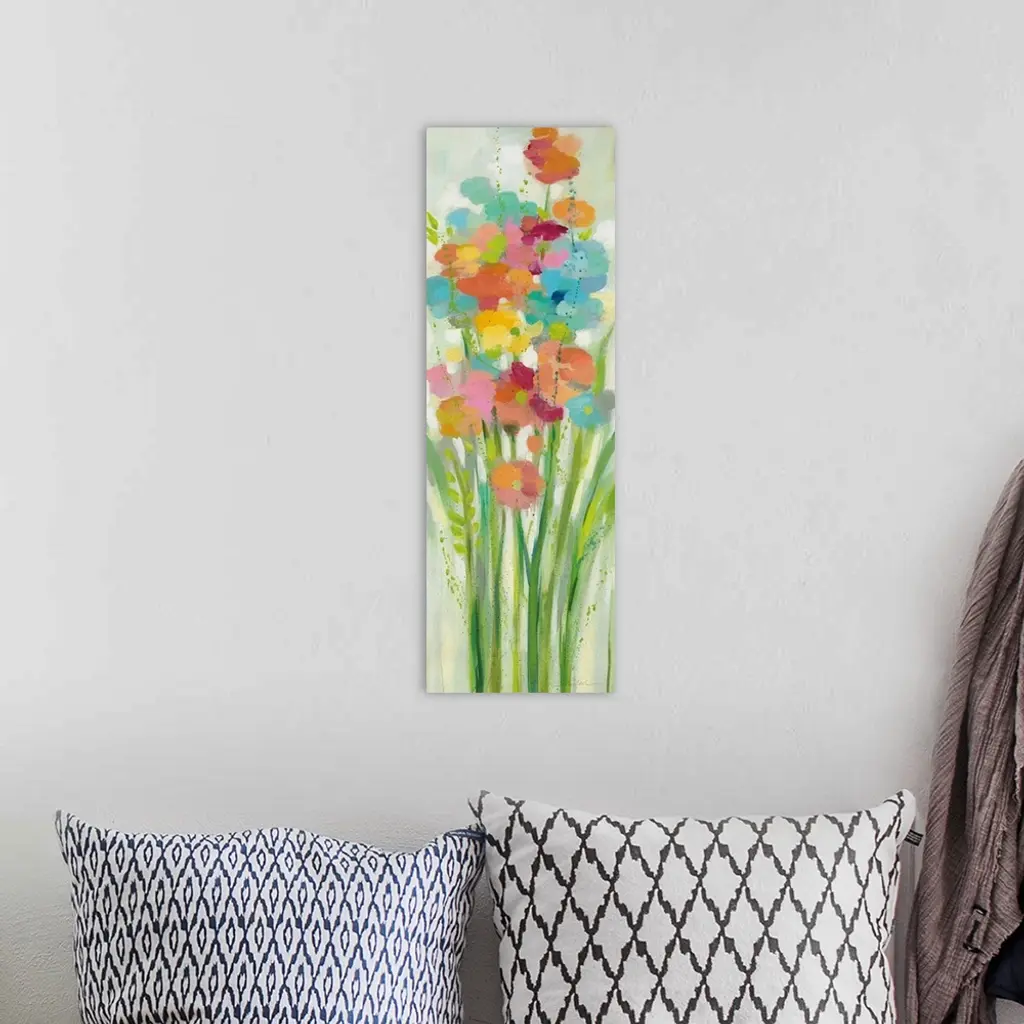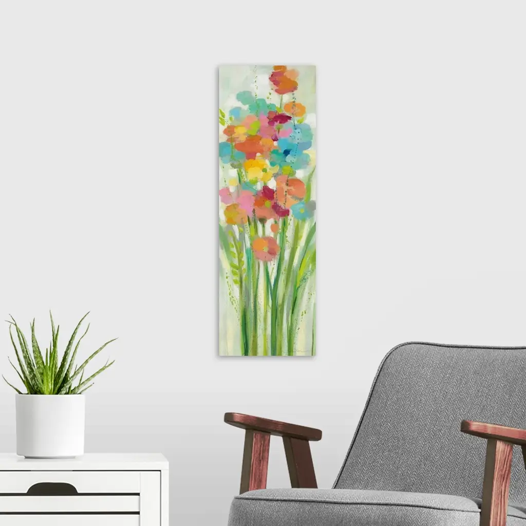 A long vertical painting of a group of stemmed flowers and leaves in cheerful colors.