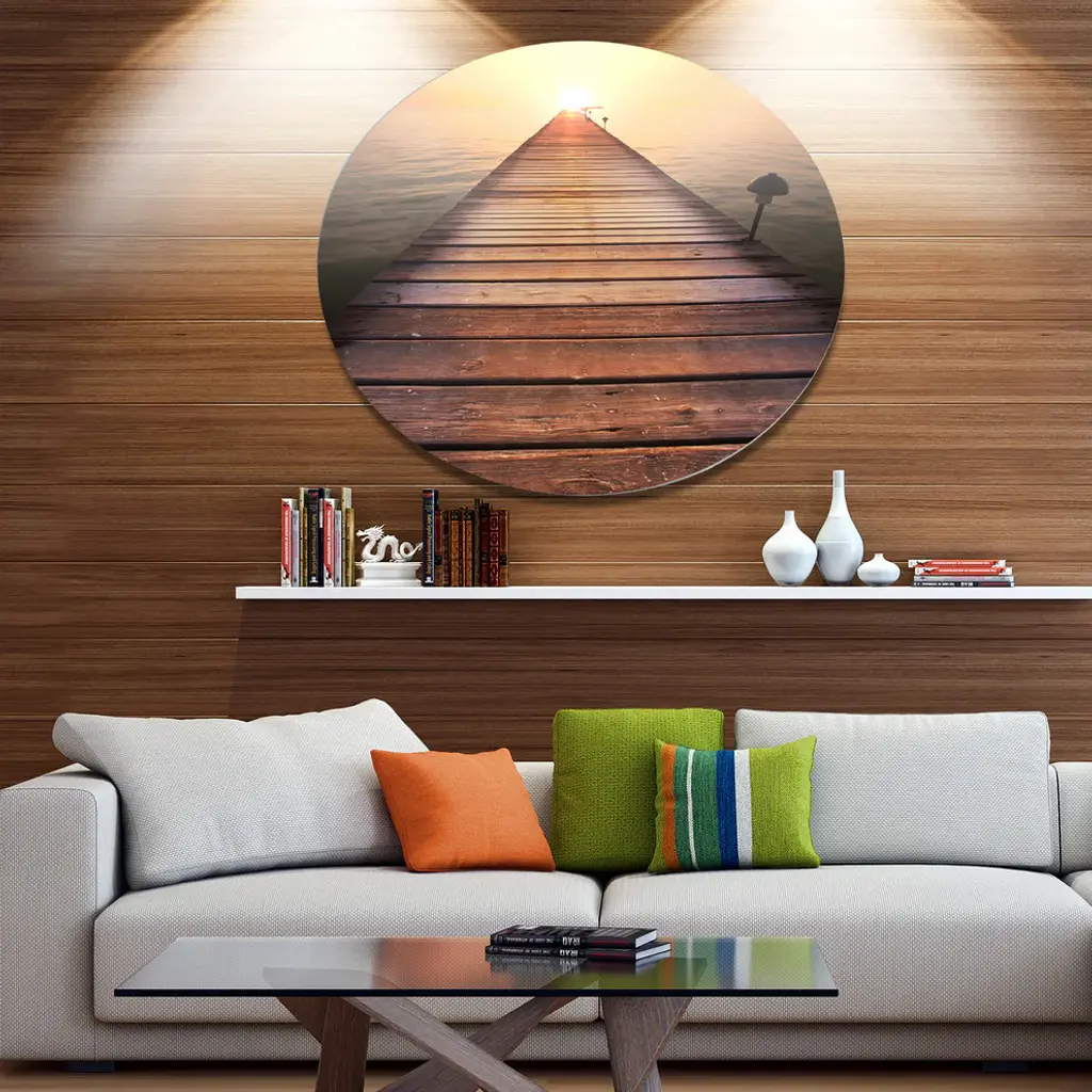 Long Wooden Boardwalk Into Sea, Seashore Round Metal Wall Art, 36"