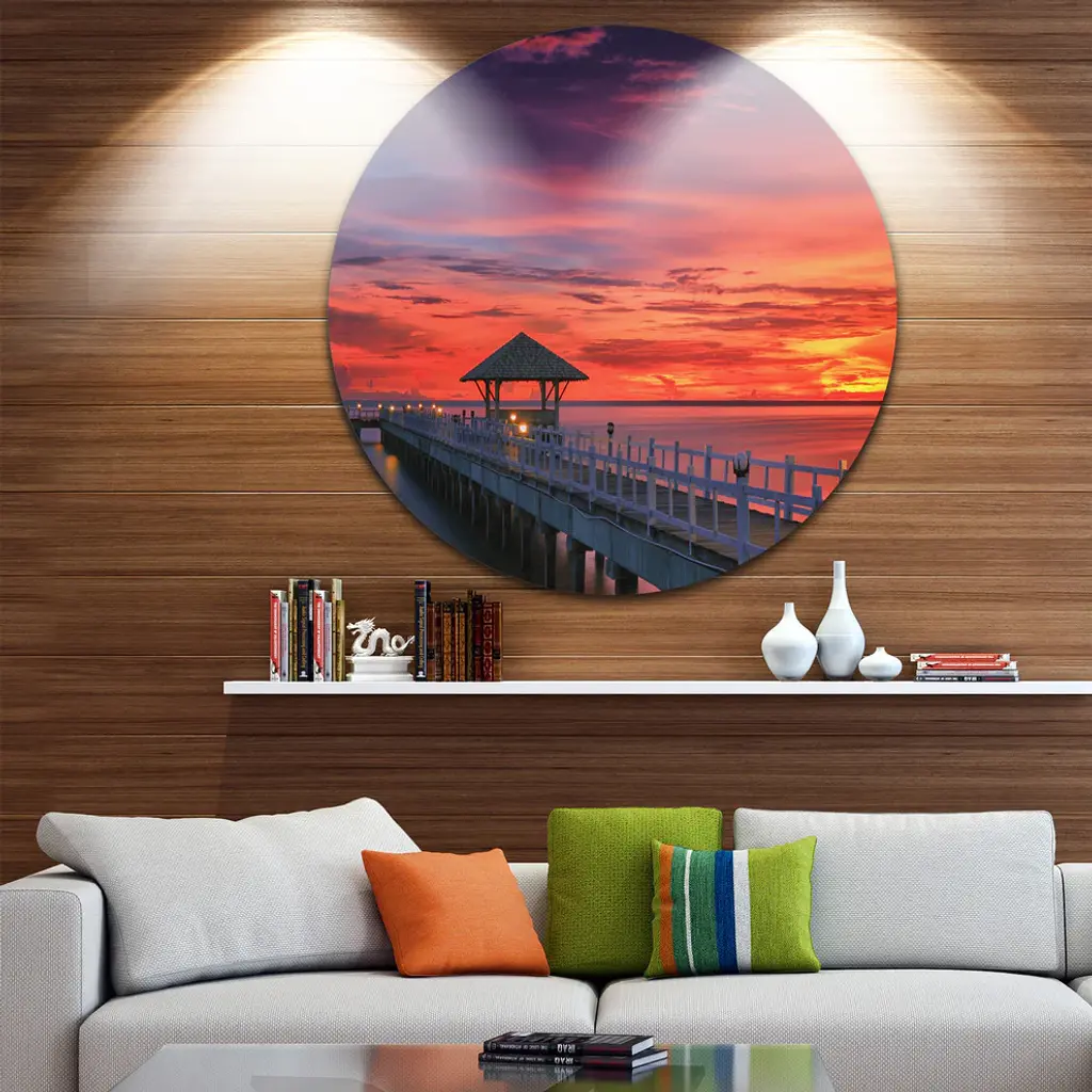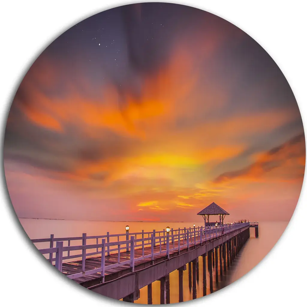 Long Wooden Bridge And Colorful Sky, Sea Bridge Round Wall Art, 23"