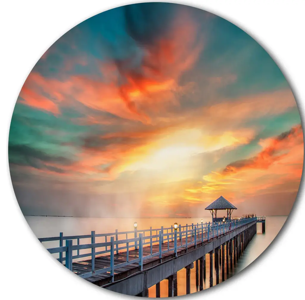Bring Contemporary Abstraction to your home with this large Circle Metal wall art. This Long Wooden Bridge and Colorful Sky Metal Artwork makes it the focal point of any room or office. - White Gloss Coating ensures colors are extra vibrant with light reflection.- Aluminum grade Sheet Metal with 1 inch mounting frame on the back giving the illusion that the artwork is floating on the wall..- Mounting Brackets are included along with instructions.- High Quality Digital images are created directly into a glossy aluminum panel producing a stunning and captivating print into the glossy finish of the metal.- Water, Fire and Scratch resistant HD Aluminum panels.- Looks better than any photo paper and guaranteed to last at least 20 years- Easy to clean with a microfiber cloth. Colors are far superior to regular Canvas Art. - Easy to Hang