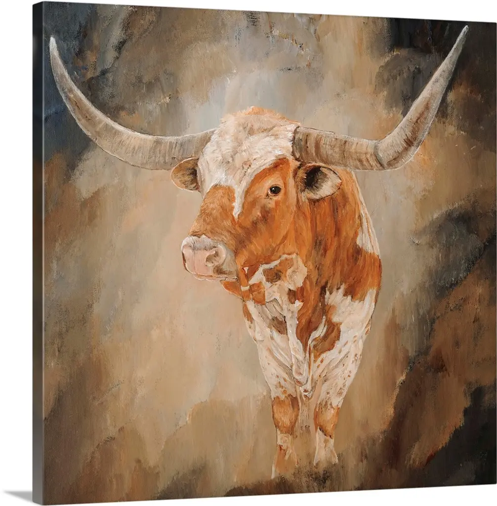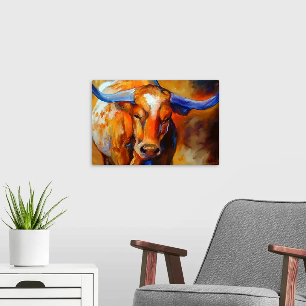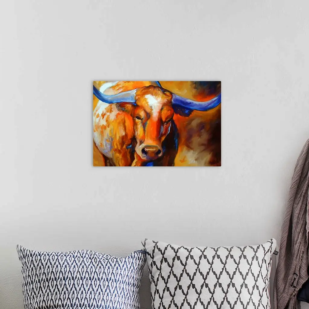 Contemporary painting of a longhorn made with warm hues and cool blues on the horns and throughout the body.