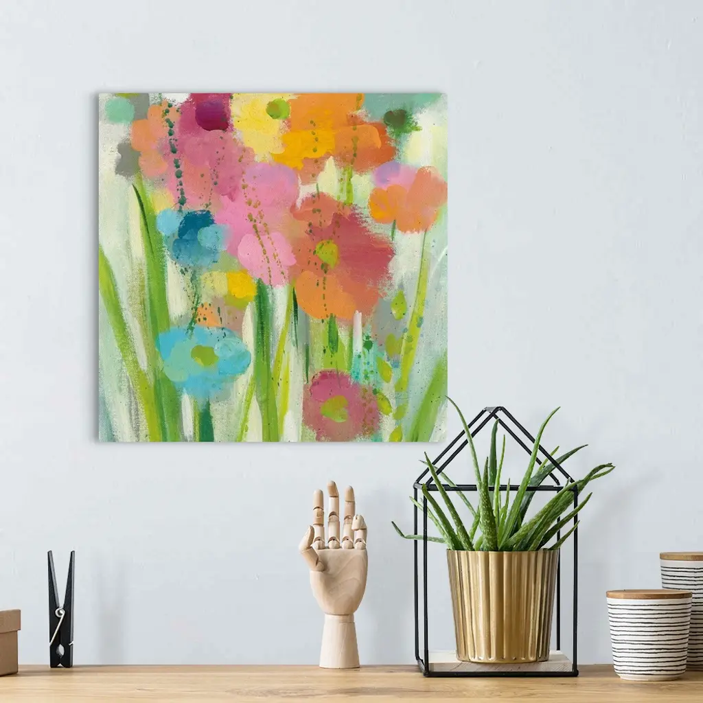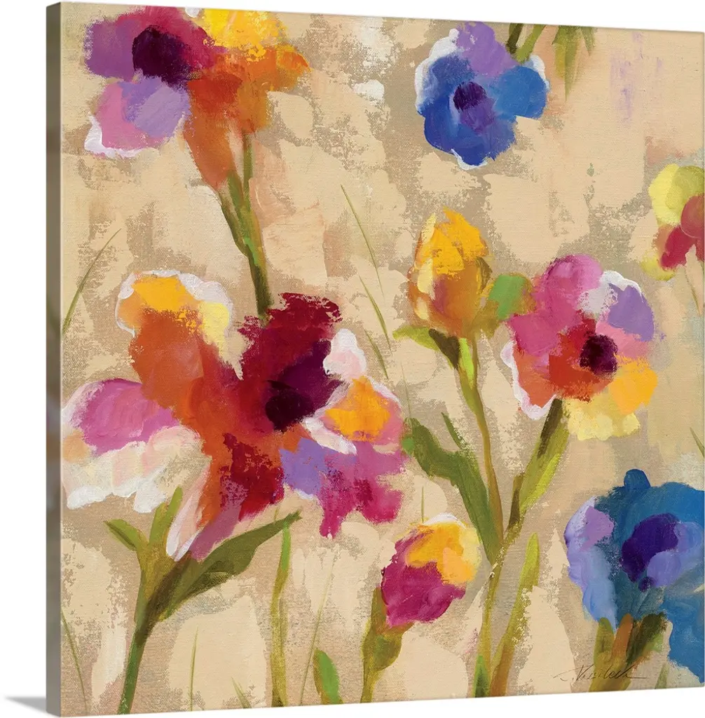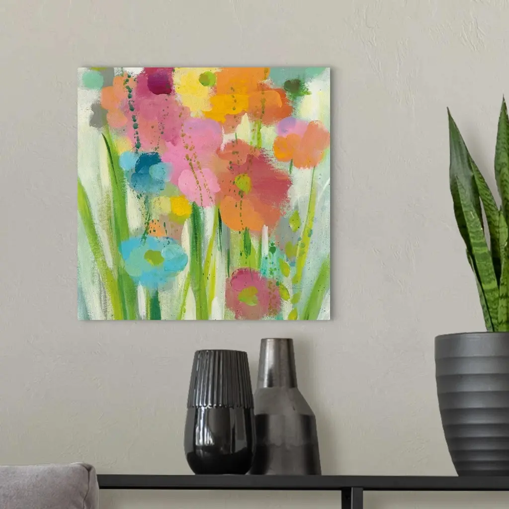 Decorative artwork of whimsical abstract florals with paint splatter throughout.