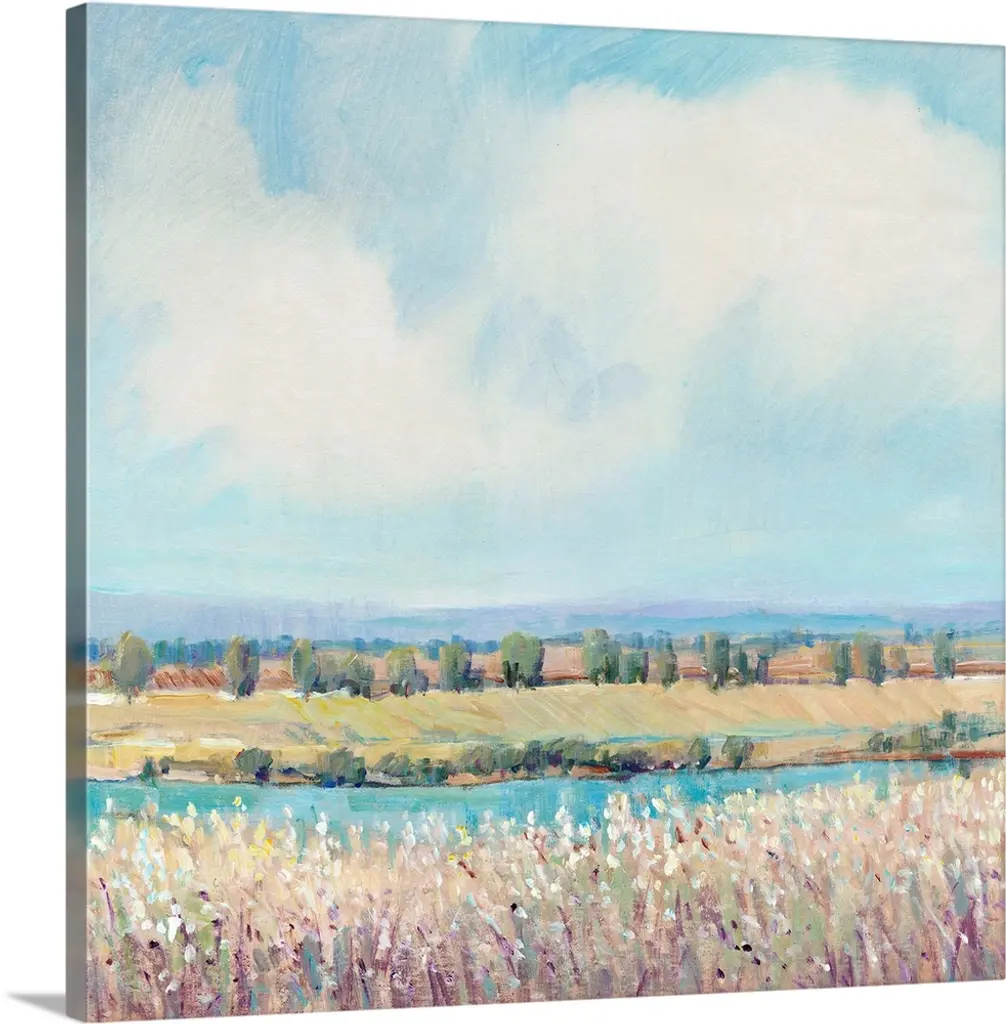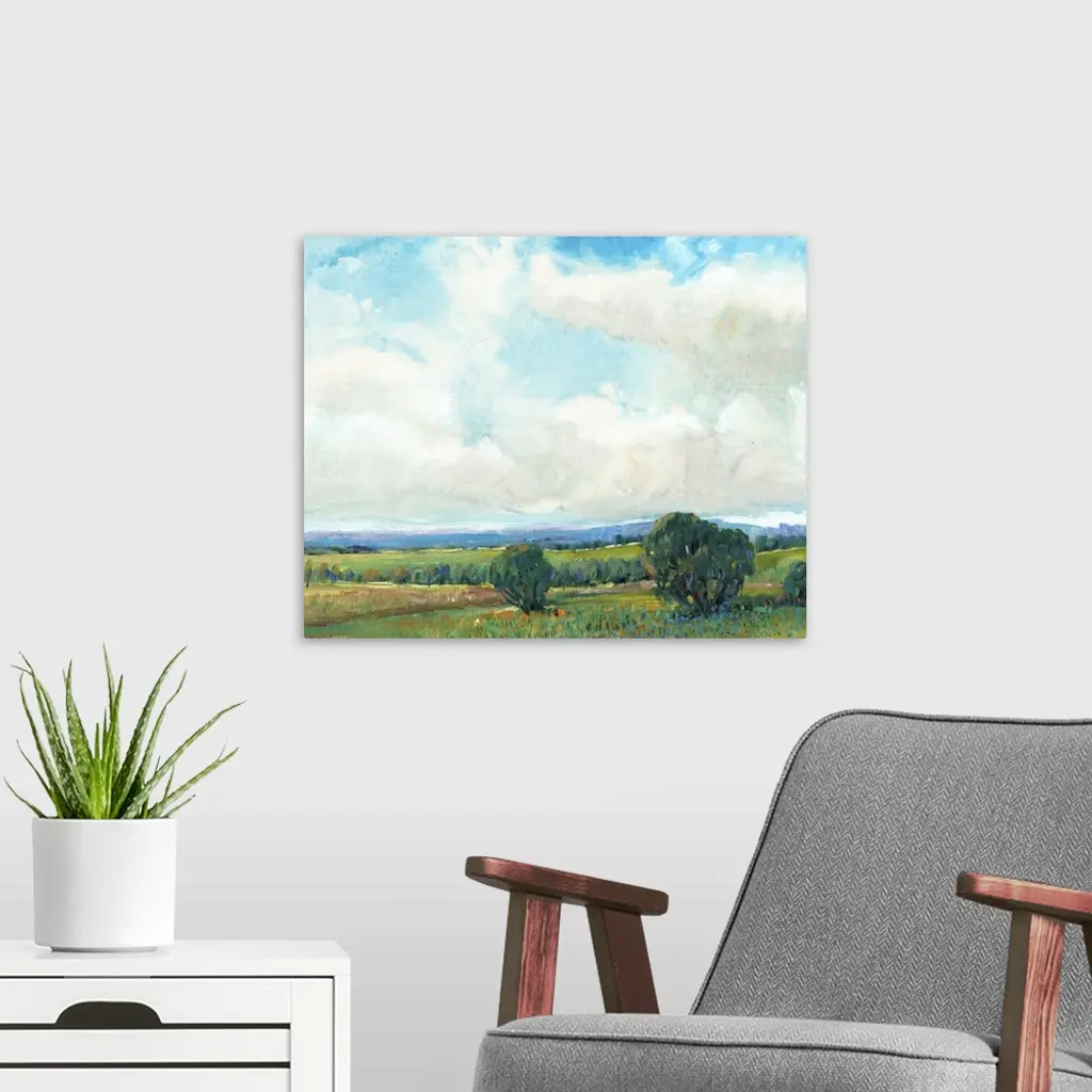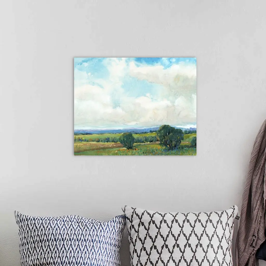 This contemporary artwork features short vertical brush strokes to create this lively countryside landscape with soft clouds above.