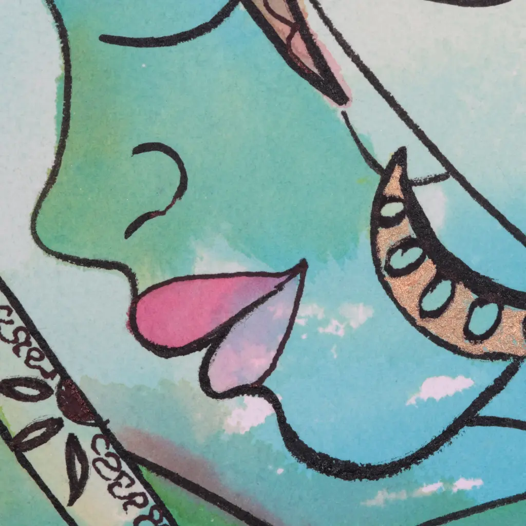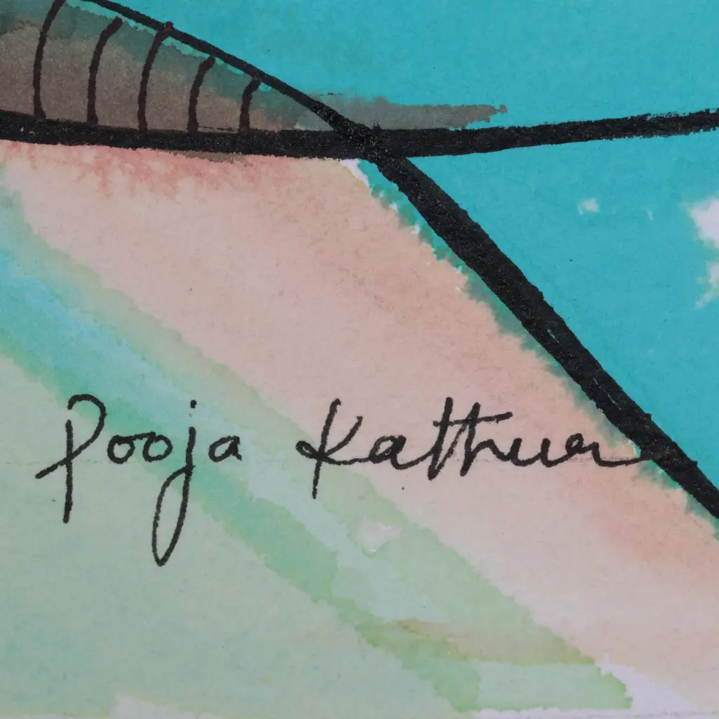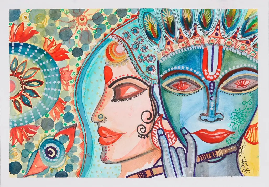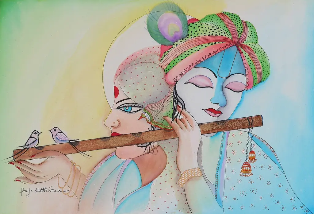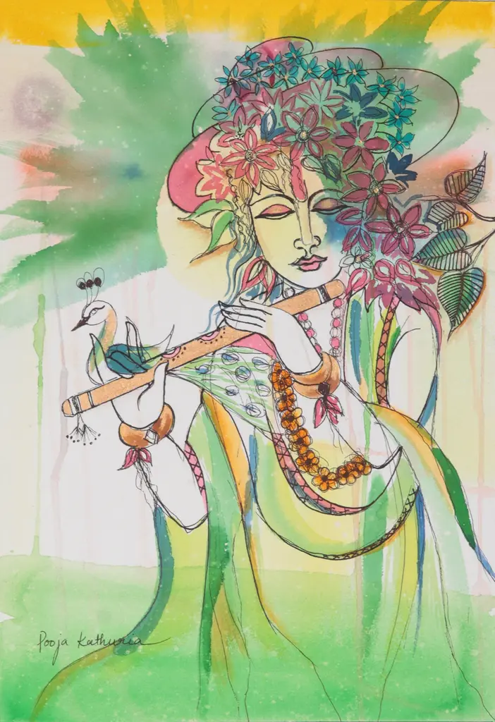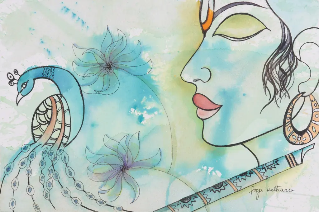 Referring to Lord Krishna as Manmohan, or 'winner of the heart', Pooja Kathuria in India paints this original artwork. She works in watercolors and acrylics on handmade paper to paint the Hindu deity accompanied by a flute and a peacock..