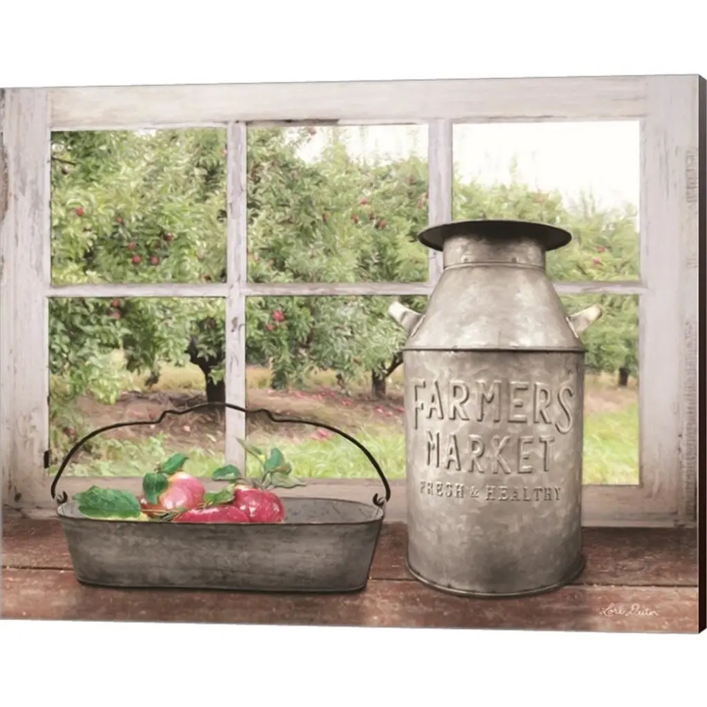 Apple Orchard by Lori Deiter is a high quality piece of canvas artwork. The finished size of this piece is 20" X 16", and it has a depth 0.75" with espresso painted sides. There is a UV protective coating over the entire image, and it is ready to hang on your wall with no hardware required.