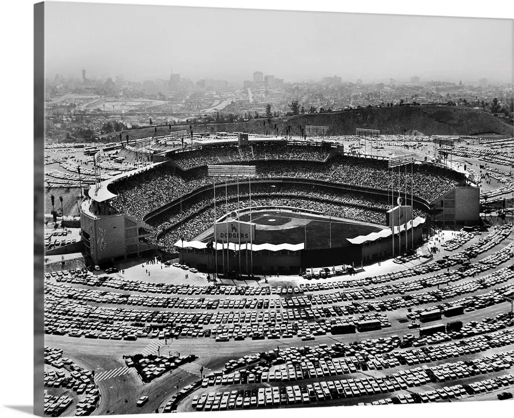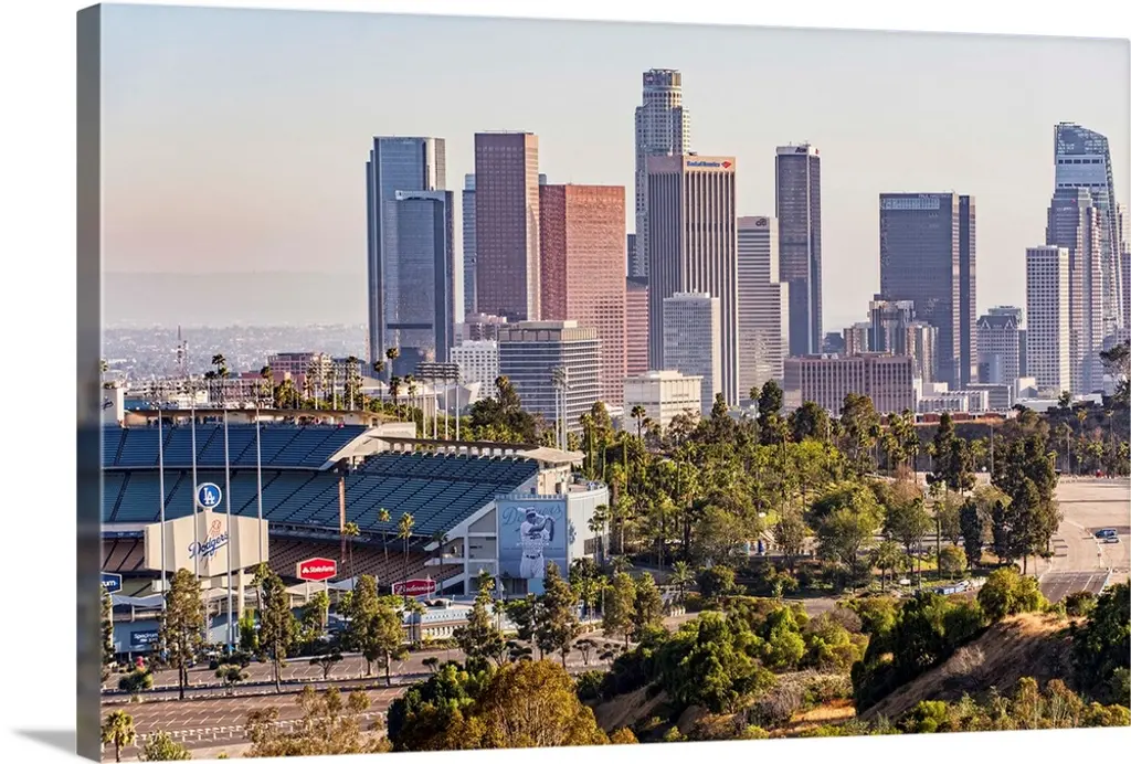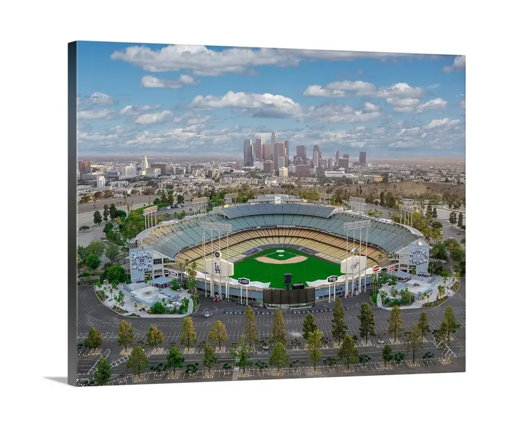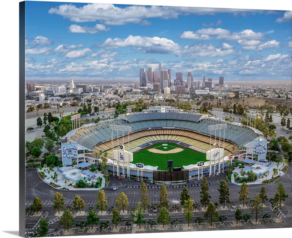 Gallery-Wrapped Canvas entitled 'Los Angeles Dodger Stadium'. Aerial view of the Dodger Stadium with the Los Angeles skyline in the distance, California. Multiple sizes available. Primary colors within this image include: Light Gray, White, Dark Forest Green, Royal Blue. Made in the USA. Satisfaction guaranteed. Archival-quality UV-resistant inks. Museum-quality, artist-grade canvas mounted on sturdy wooden stretcher bars 1.5" thick. Comes ready to hang. Canvas is acid-free and 20 millimeters thick.