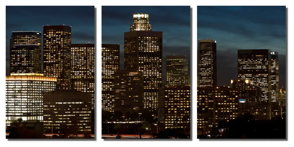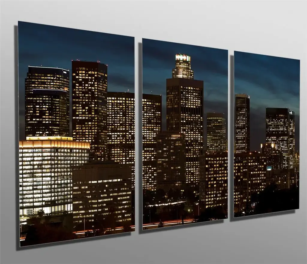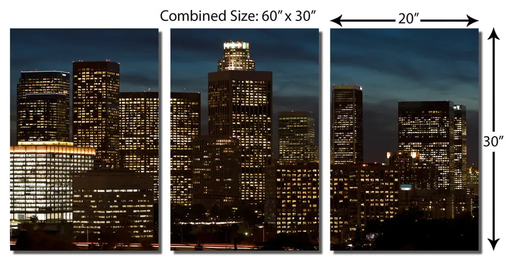 60"œ x 30"œ total size. Ready To Hang! (3 pieces - 20"œ x 30"œ each). 3 Panel Split (Triptych) Metal Print of Los Angeles Skyline at Dusk. Modern metal wall art for home or office wall decor & interior design. Printed on Luxurious, HD aluminum glossy metal panels. Multi panel art.. HD aluminum panels. Metal print wall art. Includes Shadow Wall Mount on the back.• Aluminum Metal Wall Art• Made in USA• Ready to hang - No assembly required• Shadow mount hardware on the back• 0.045"œ thick HD Aluminum Panels• Scratch resistant, glossy finish• Superb color clarity, luxurious prints• Epson printing process• For indoor or moisture rich environment use• Easy to clean. Gently wipe with microfiber cloth.