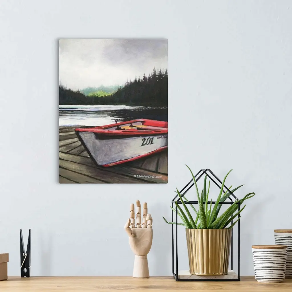 Lost Lake in Oregon is a beautiful calm lake sitting underneath the majestic Mount Hood. This piece shows the foggy morning painted into the soft sky with the focus on the row boat in the foreground. This painting represents the calm lake early in the morning, with everything muted but the red accents of the boat.
