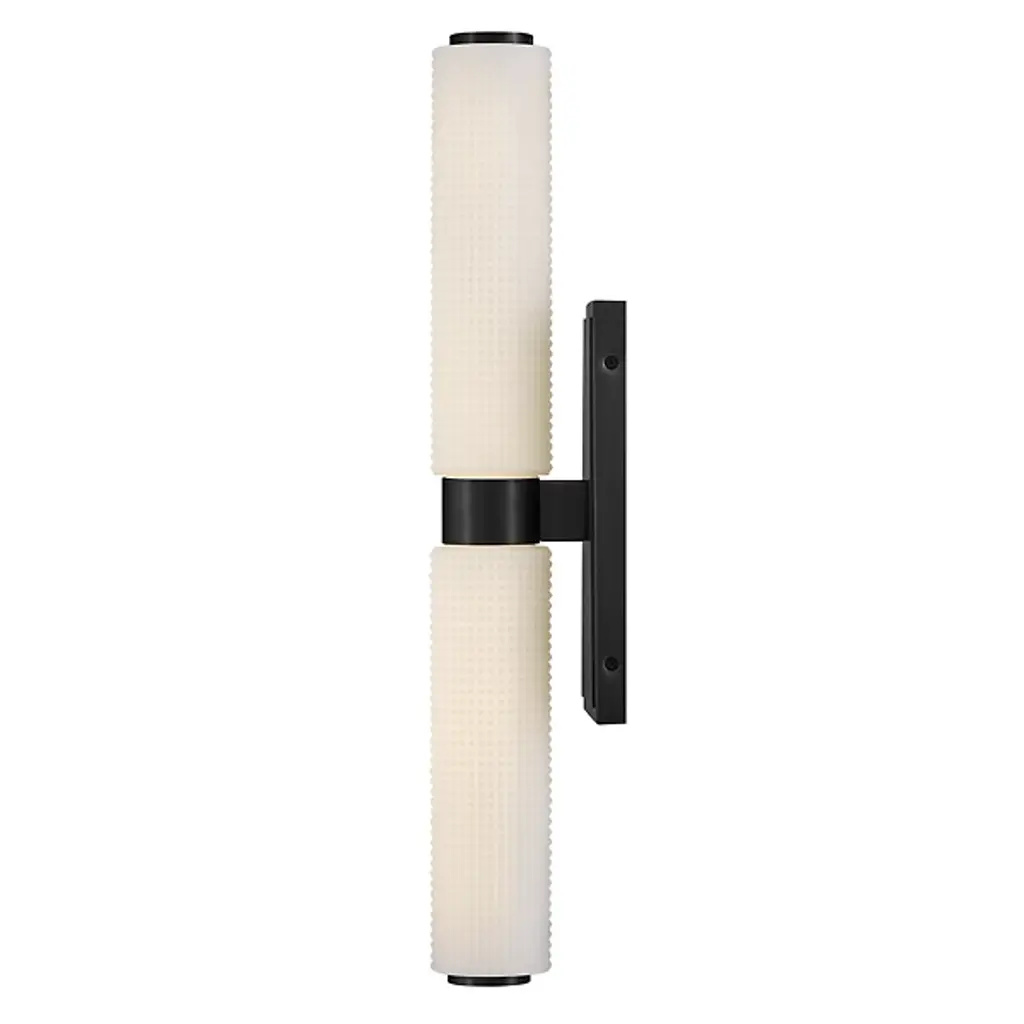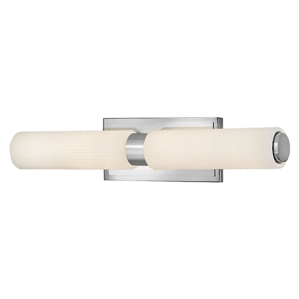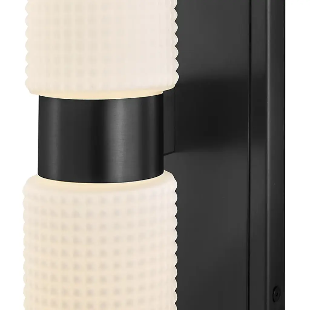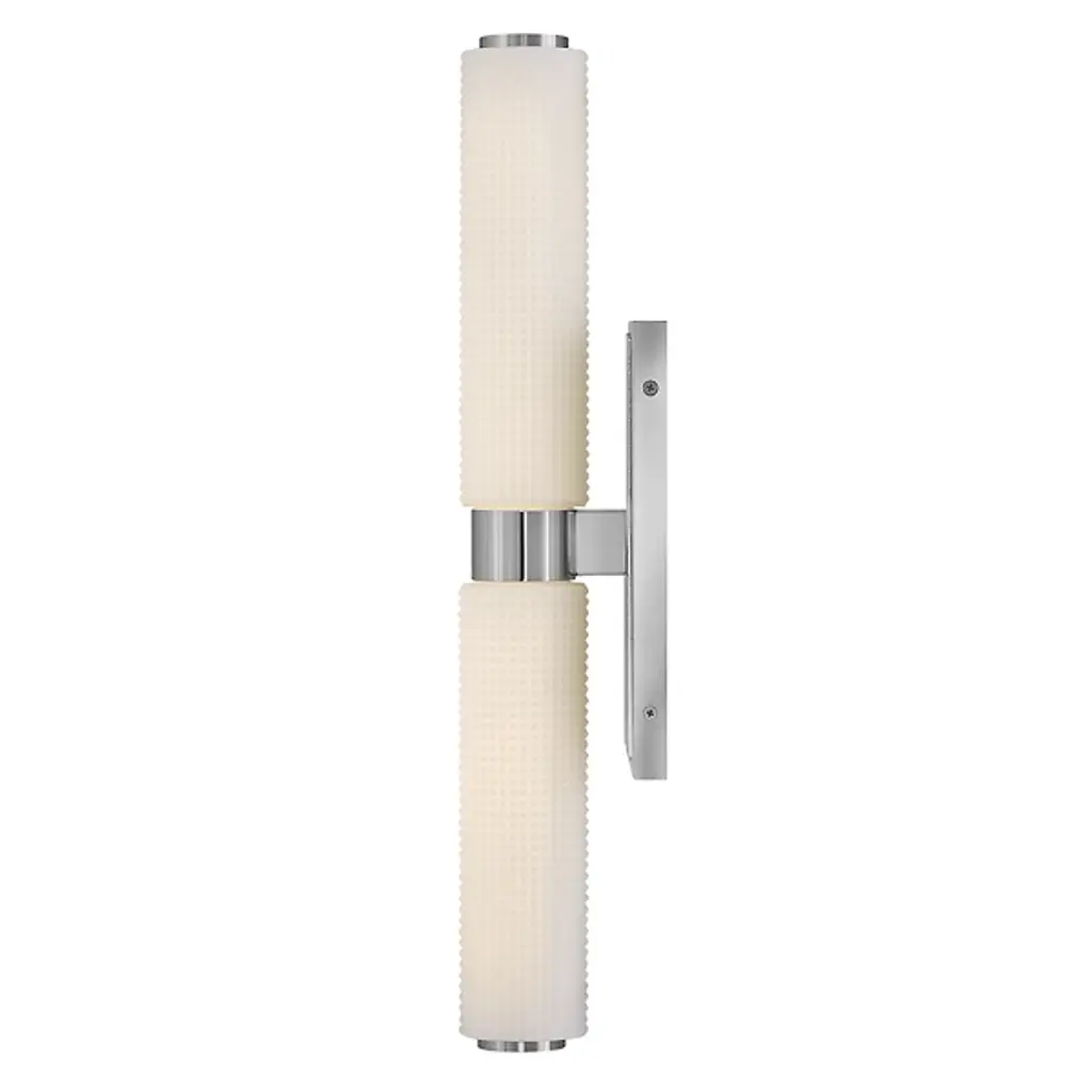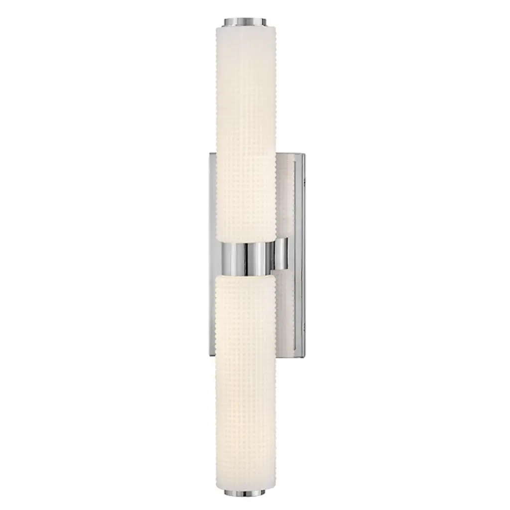 The Lottie LED Vanity Light from Hinkley adds a gorgeous glow and precision-crafted charm to walls. Each lamp is strong and straightforward, featuring a stepped rectangle wall plate and a smooth central collar. Damp-listed LEDs emerge from either side of the collar, surrounded by cylinder shades of Etched Opal Holophane glass, with minuke knurls that give a more industrial impression. Able to mount vertically or horizontally, the translucent glass casts a refracted radiance around the fixture, bouncing off the smooth backplate to shine as an added accent.