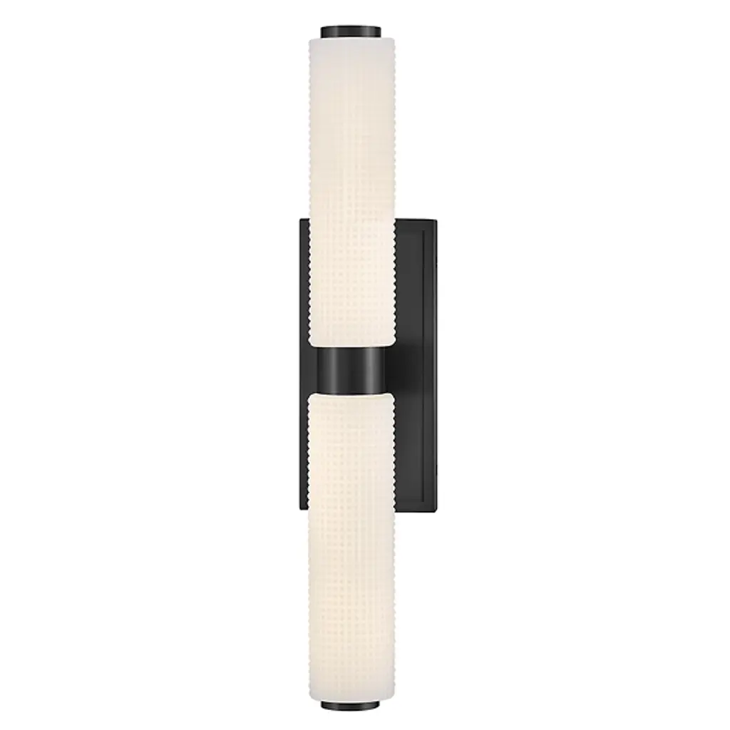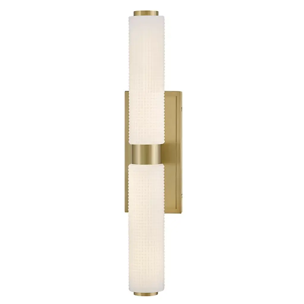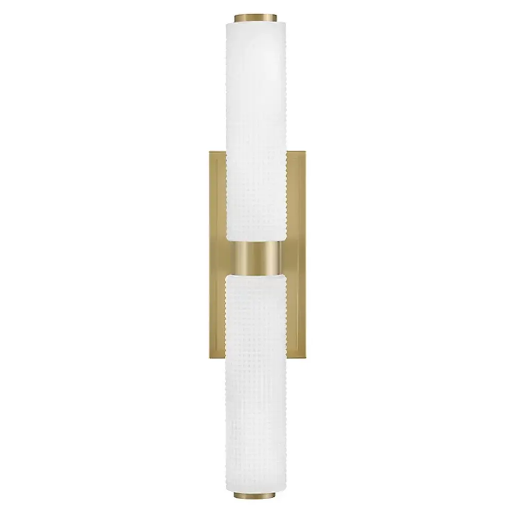 The Lottie LED Vanity Light from Hinkley adds a gorgeous glow and precision-crafted charm to walls. Each lamp is strong and straightforward, featuring a stepped rectangle wall plate and a smooth central collar. Damp-listed LEDs emerge from either side of the collar, surrounded by cylinder shades of Etched Opal Holophane glass, with minuke knurls that give a more industrial impression. Able to mount vertically or horizontally, the translucent glass casts a refracted radiance around the fixture, bouncing off the smooth backplate to shine as an added accent.