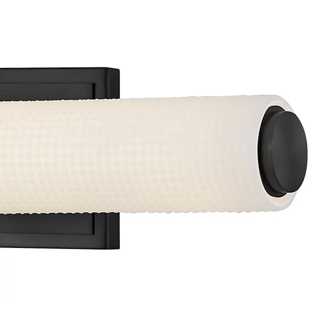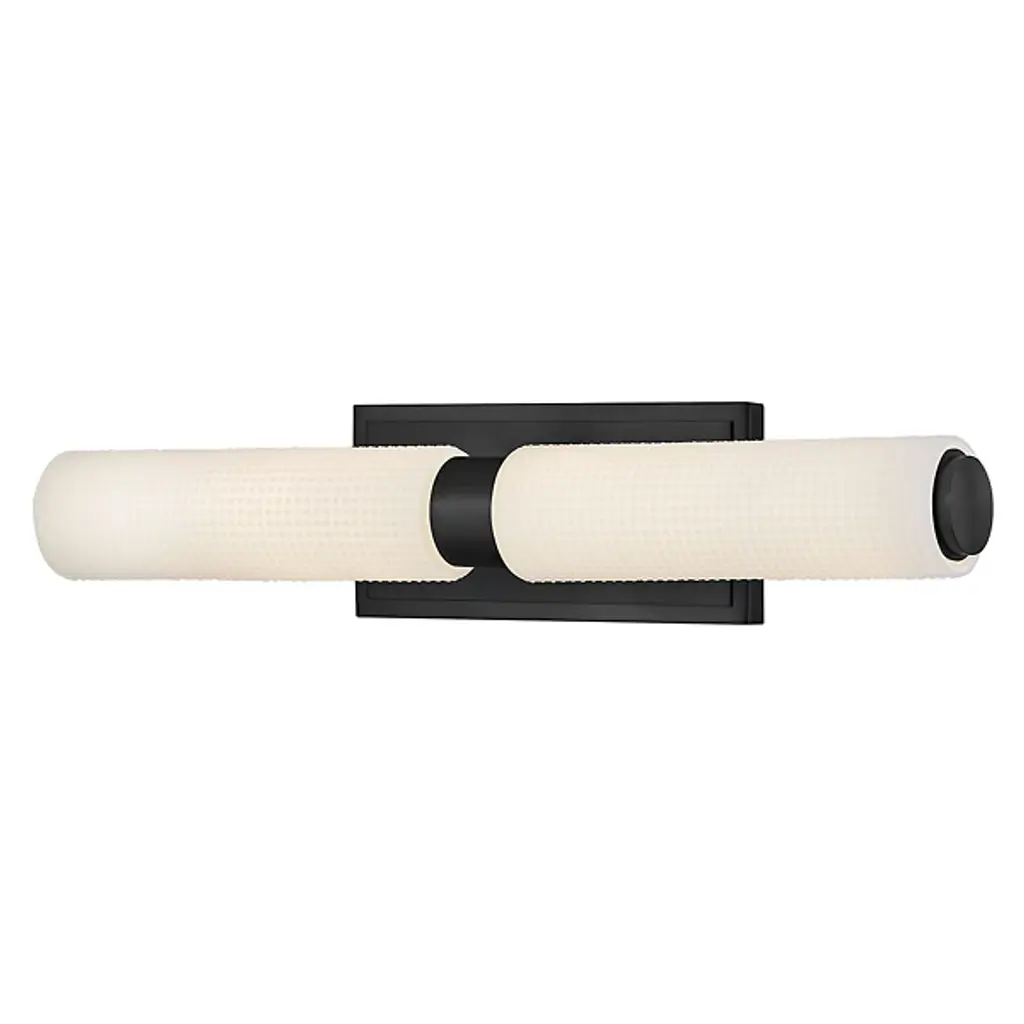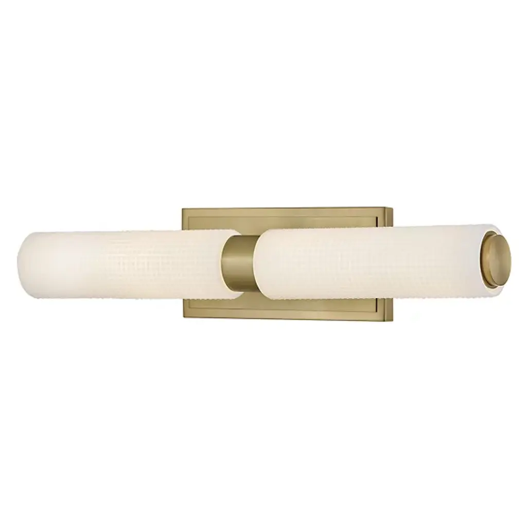 The Lottie LED Vanity Light from Hinkley adds a gorgeous glow and precision-crafted charm to walls. Each lamp is strong and straightforward, featuring a stepped rectangle wall plate and a smooth central collar. Damp-listed LEDs emerge from either side of the collar, surrounded by cylinder shades of Etched Opal Holophane glass, with minuke knurls that give a more industrial impression. Able to mount vertically or horizontally, the translucent glass casts a refracted radiance around the fixture, bouncing off the smooth backplate to shine as an added accent.