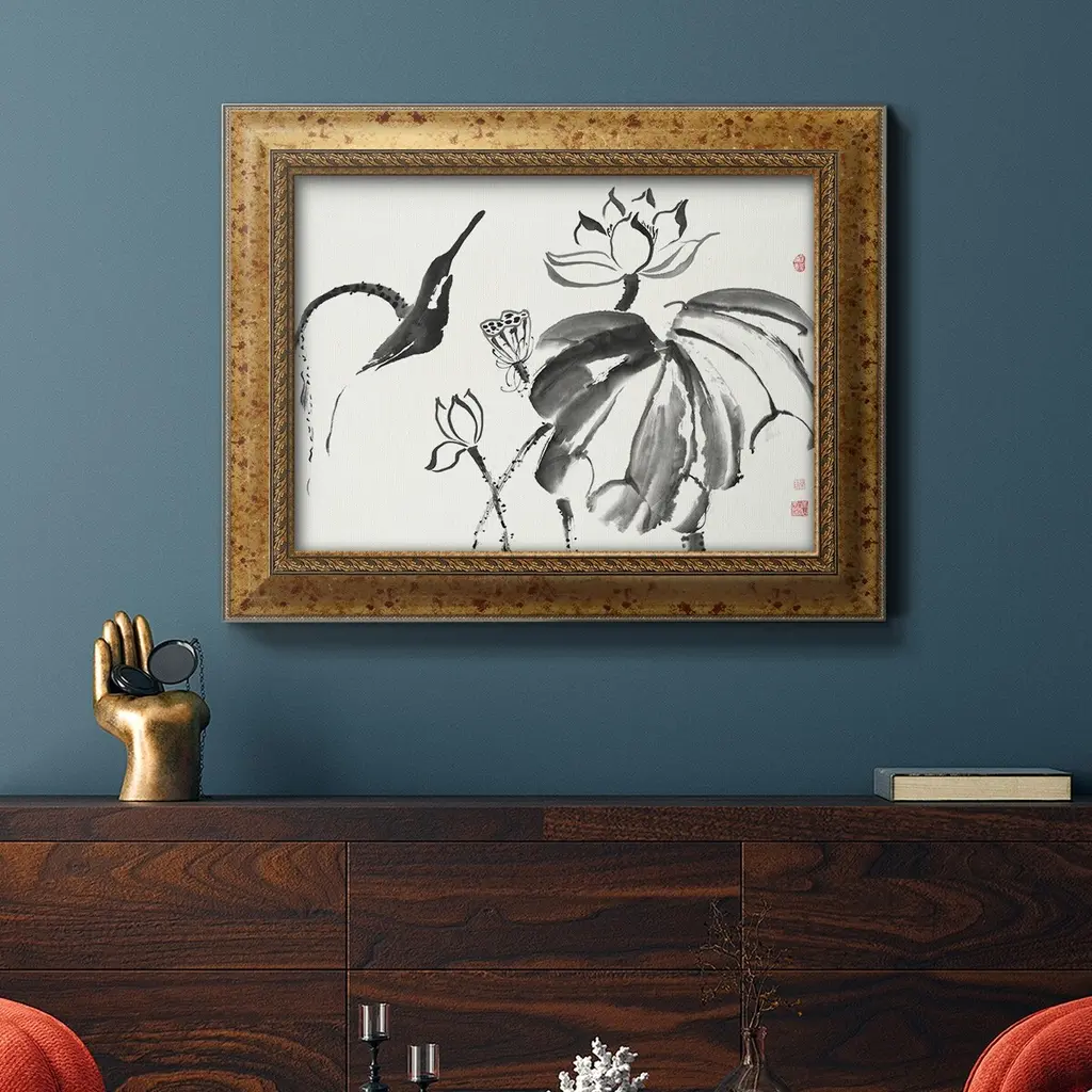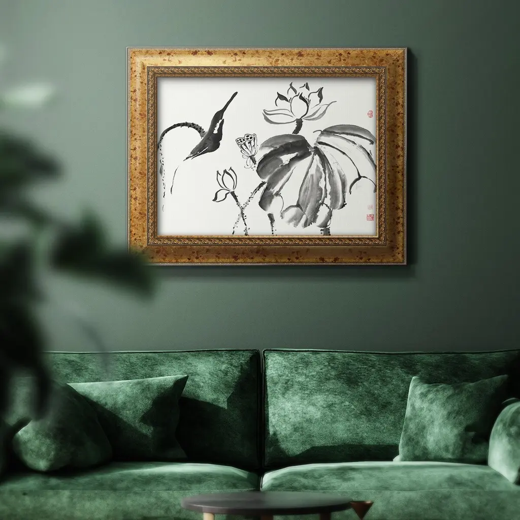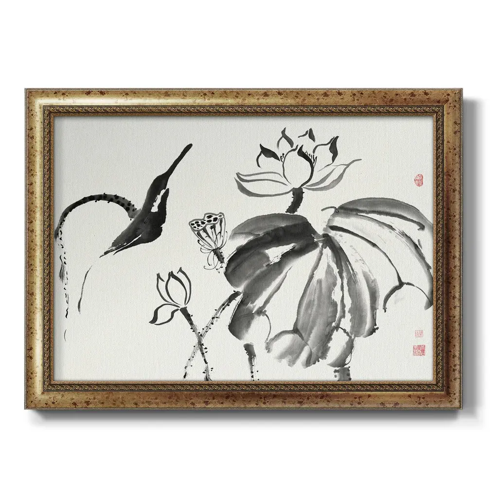 Lotus Study I Premium Framed Canvas- Ready to Hang A Premium Framed Canvas created to last. Framed in distressed wood and available in an array of sizes and colors Featuring a beveled a solid wood stretcher bar, each piece comes ready to hand 3 SIZES AVAILABLE 16''X20'' - Overall Size 18'X27'' - Overall Size 24''x36'' - Overall Size Each piece is made to order. Each piece comes with hanging hardware. Made in the USA Ready to Hang Giclee Paper Print Acrylic Glass Beveled Matt Board