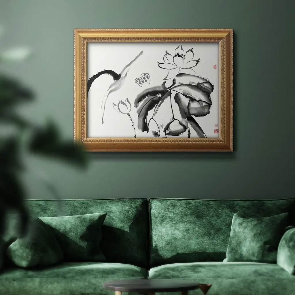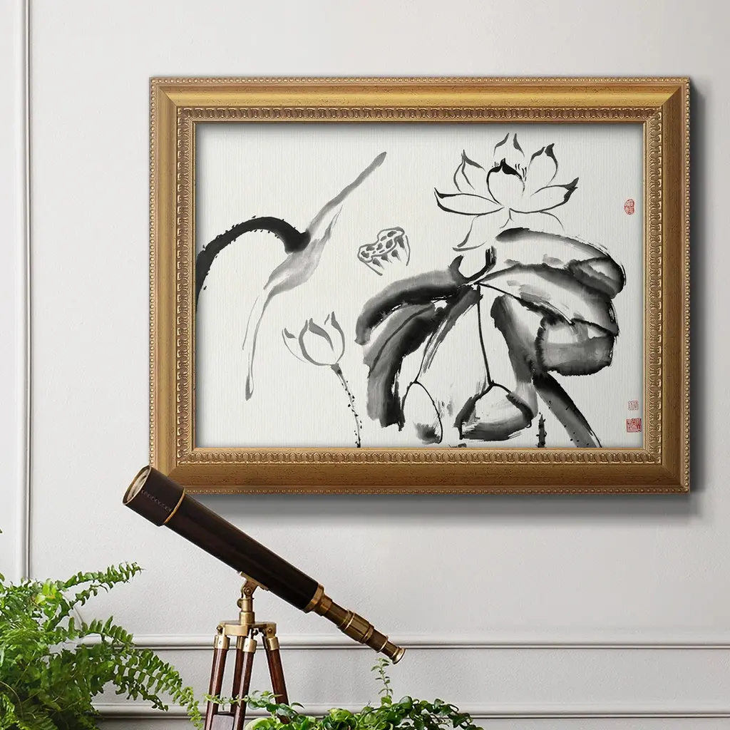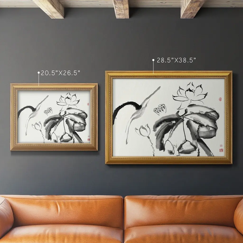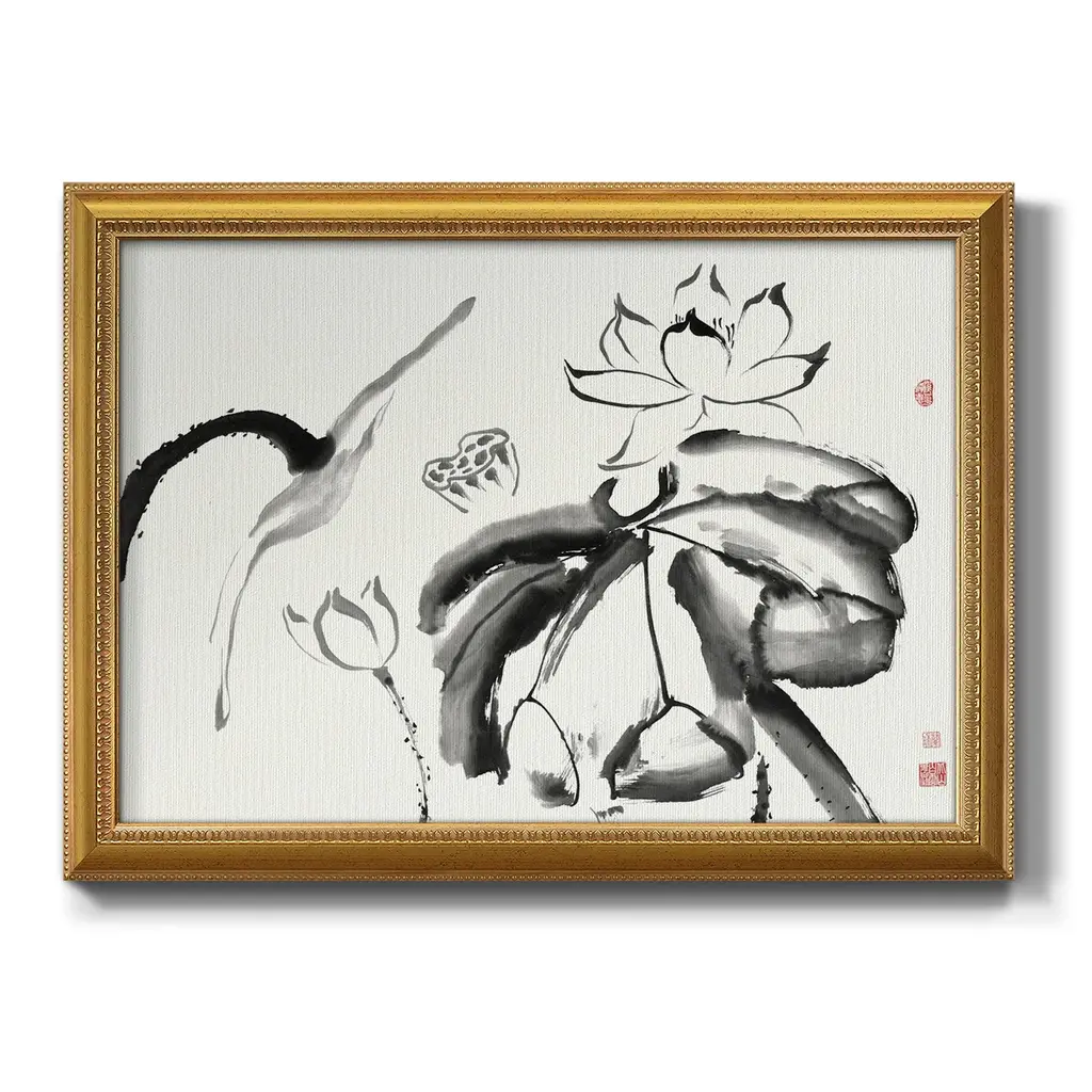 Lotus Study III Premium Framed Canvas- Ready to Hang A Premium Framed Canvas created to last. Framed in distressed wood and available in an array of sizes and colors Featuring a beveled a solid wood stretcher bar, each piece comes ready to hand 3 SIZES AVAILABLE 16''X20'' - Overall Size 18'X27'' - Overall Size 24''x36'' - Overall Size Each piece is made to order. Each piece comes with hanging hardware. Made in the USA Ready to Hang Giclee Paper Print Acrylic Glass Beveled Matt Board