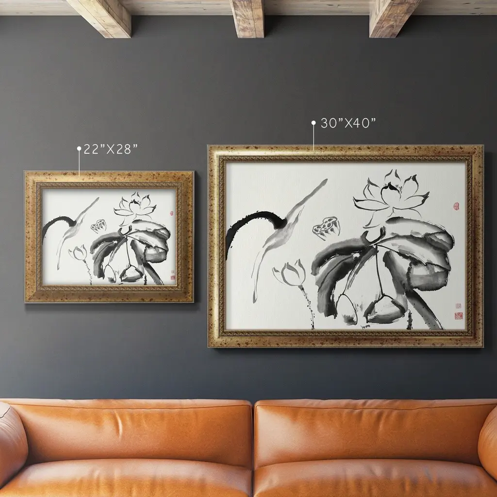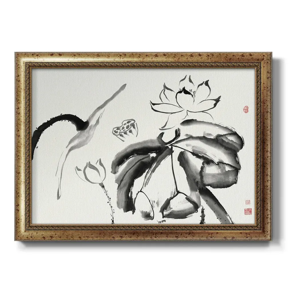 Lotus Study III Premium Framed Canvas- Ready to Hang A Premium Framed Canvas created to last. Framed in distressed wood and available in an array of sizes and colors Featuring a beveled a solid wood stretcher bar, each piece comes ready to hand 3 SIZES AVAILABLE 16''X20'' - Overall Size 18'X27'' - Overall Size 24''x36'' - Overall Size Each piece is made to order. Each piece comes with hanging hardware. Made in the USA Ready to Hang Giclee Paper Print Acrylic Glass Beveled Matt Board