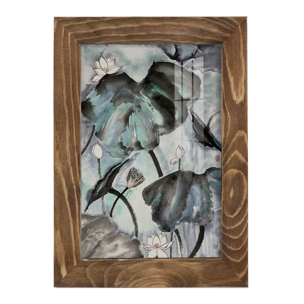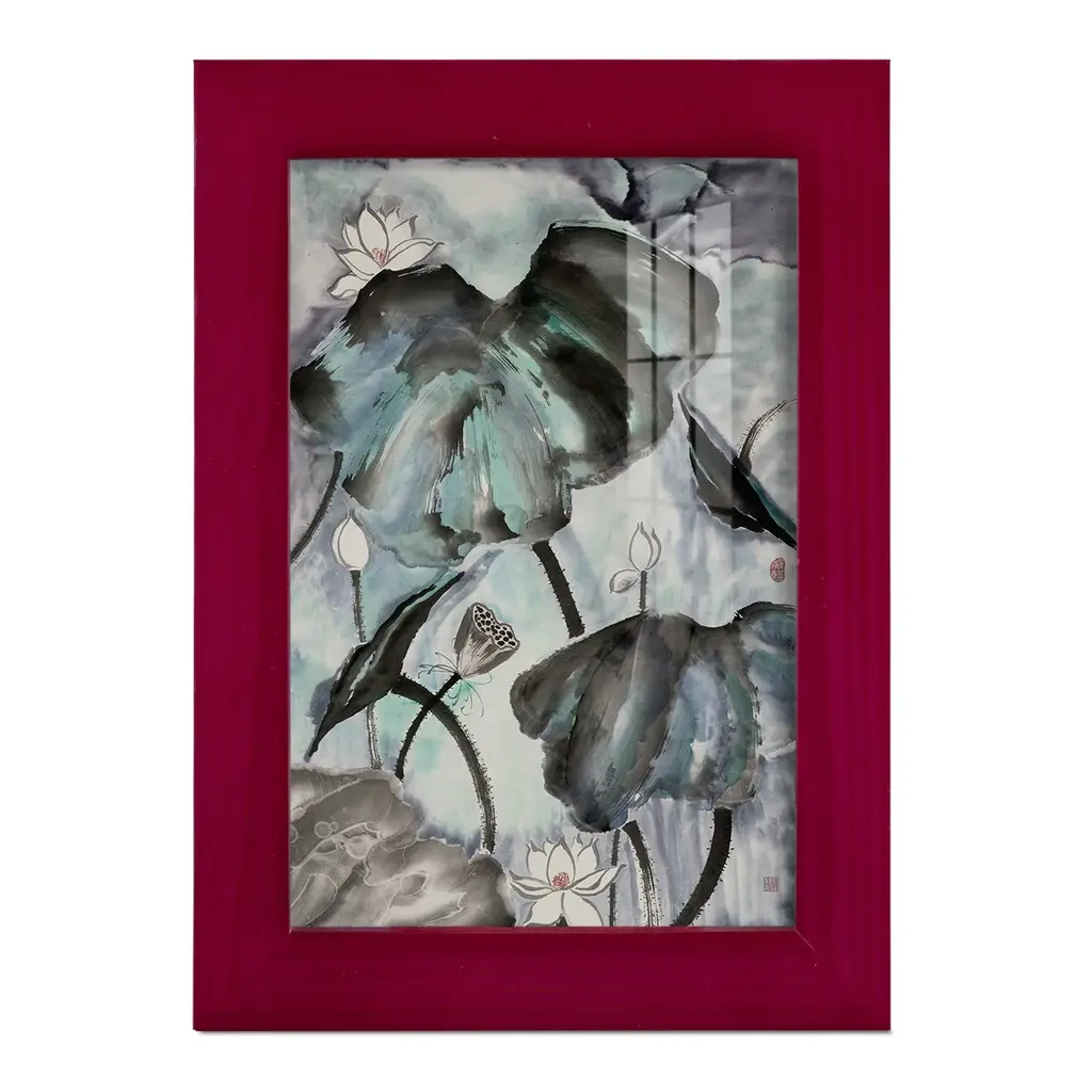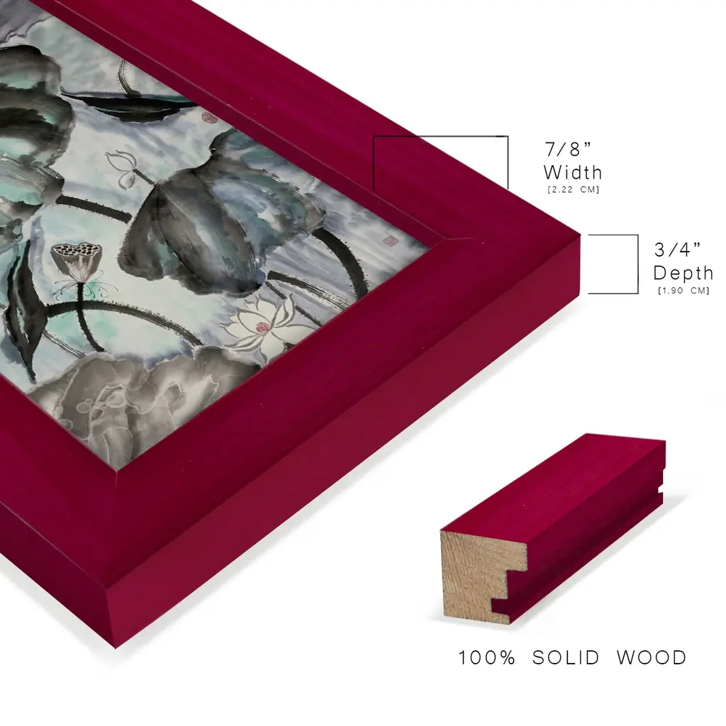Lotus Study with Blue Green II -EZ SWITCH Framed Print w/glass-Cherry Red A delightful, framed print. Featuring a solid wood frame with real wood glass. This premium print is giclee quality. In addition, every frame features a removable back and table top stand. This allows you to change your art in the future or to just stand the art on a table for a new look. We are sure you'll enjoy our new series of EZ SWITCH Framed Art. Solid Wood Frame Real Glass Removable / Replaceable Art Built in Tabletop Stand Sizes range from 4x6 up to 12x15 - buy just one or pair them up as sets as you see fit.