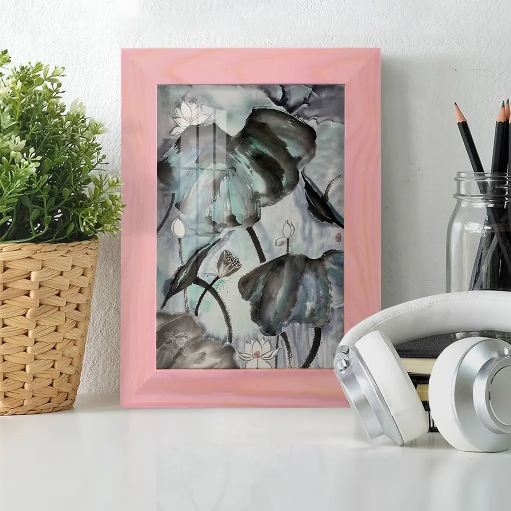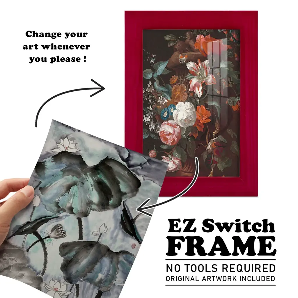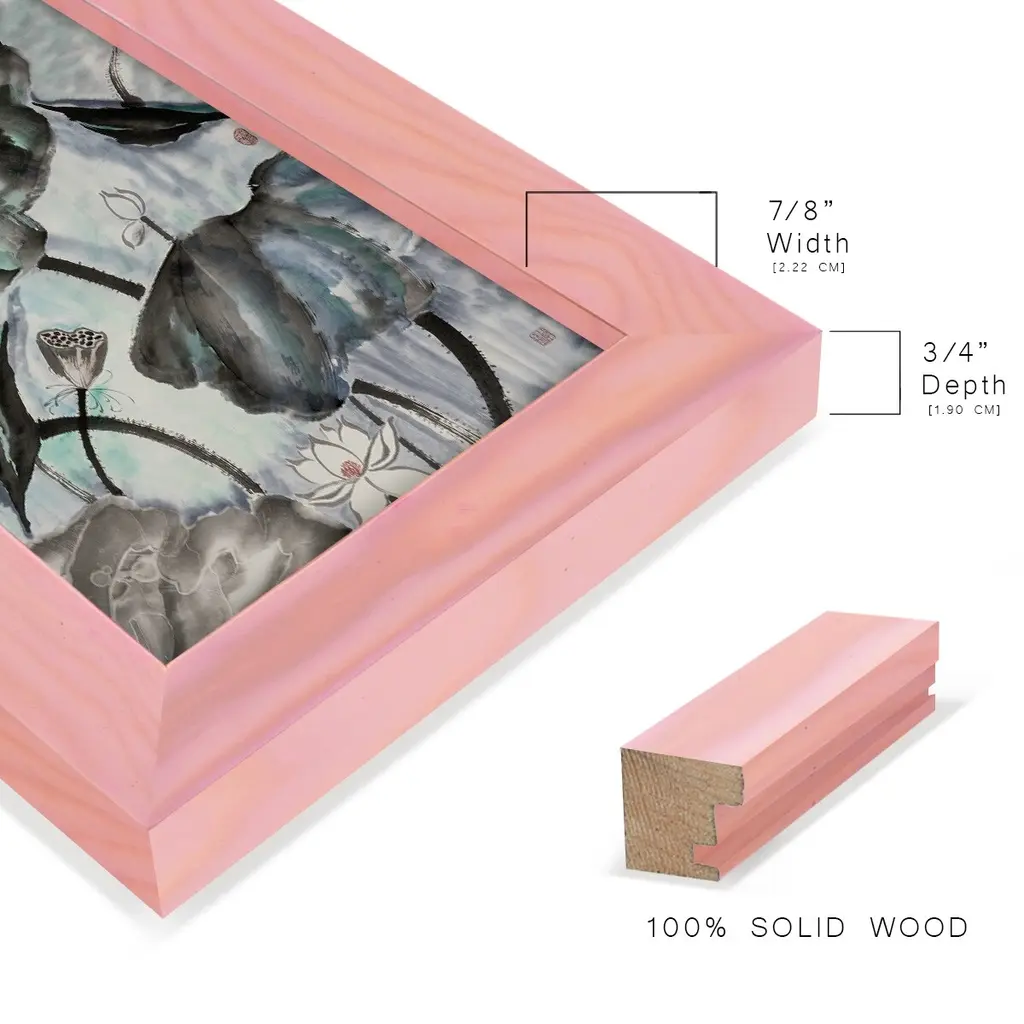 Lotus Study with Blue Green II -EZ SWITCH Framed Print w/glass-Cherry Red A delightful, framed print. Featuring a solid wood frame with real wood glass. This premium print is giclee quality. In addition, every frame features a removable back and table top stand. This allows you to change your art in the future or to just stand the art on a table for a new look. We are sure you'll enjoy our new series of EZ SWITCH Framed Art. Solid Wood Frame Real Glass Removable / Replaceable Art Built in Tabletop Stand Sizes range from 4x6 up to 12x15 - buy just one or pair them up as sets as you see fit.