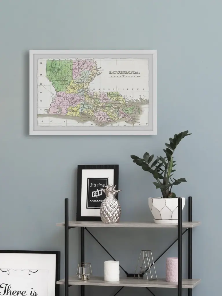 This colorful map features the entire state of Louisiana and its bordering states. Proudly printed in the USA, this piece is printed on high quality archive paper and professionally hand-framed. With wall-mounting hooks included, this artful accent is ready to hang up as soon as it reaches your front door.- Top quality Gicle print on high resolution Archive Paper- Hand cut deckled edges- High quality durable non-warping frame- Finished under shatter resistant plexiglass- Arrives ready to hang- Includes a certificate of authenticity- Printed in the USA