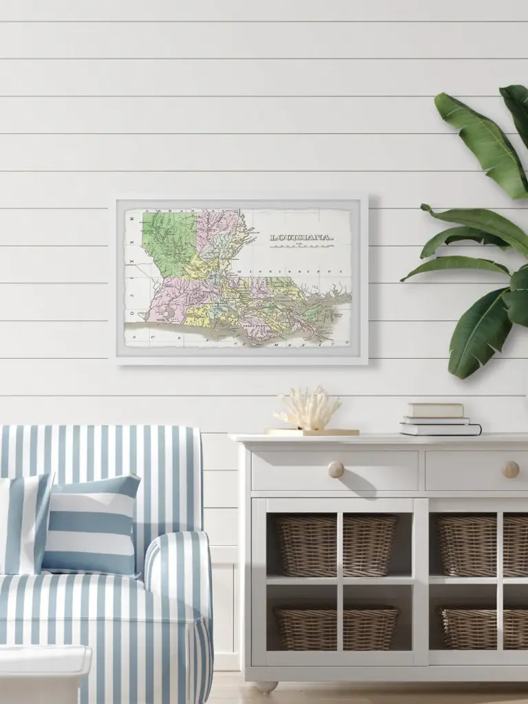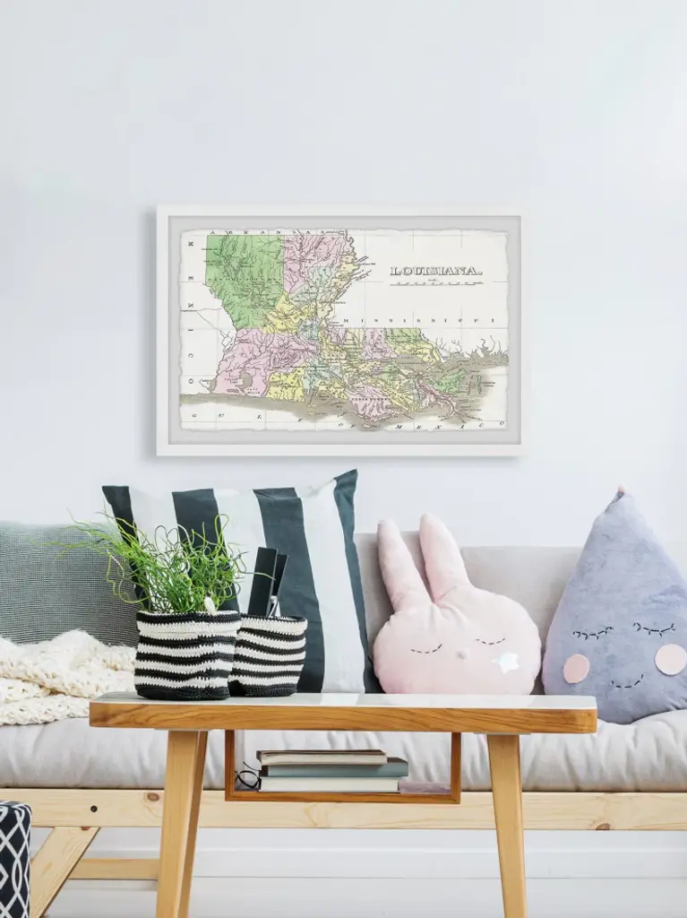 This colorful map features the entire state of Louisiana and its bordering states. Proudly printed in the USA, this piece is printed on high quality archive paper and professionally hand-framed. With wall-mounting hooks included, this artful accent is ready to hang up as soon as it reaches your front door.- Top quality Gicle print on high resolution Archive Paper- Hand cut deckled edges- High quality durable non-warping frame- Finished under shatter resistant plexiglass- Arrives ready to hang- Includes a certificate of authenticity- Printed in the USA
