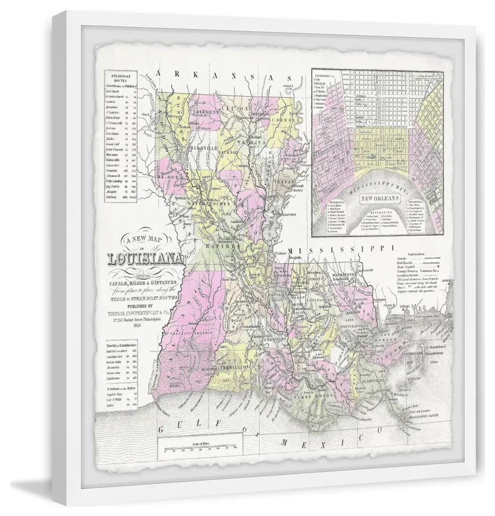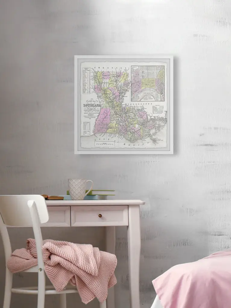 This colorful map features the entire state of Louisiana and its bordering states. Proudly printed in the USA, this piece is printed on high quality archive paper and professionally hand-framed. With wall-mounting hooks included, this artful accent is ready to hang up as soon as it reaches your front door.- Top quality Gicle print on high resolution Archive Paper- Hand cut deckled edges- High quality durable non-warping frame- Finished under shatter resistant plexiglass- Arrives ready to hang- Includes a certificate of authenticity- Printed in the USA