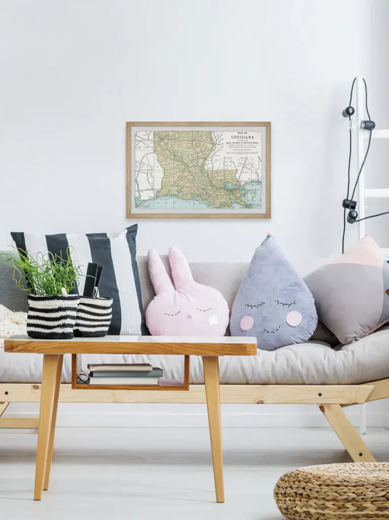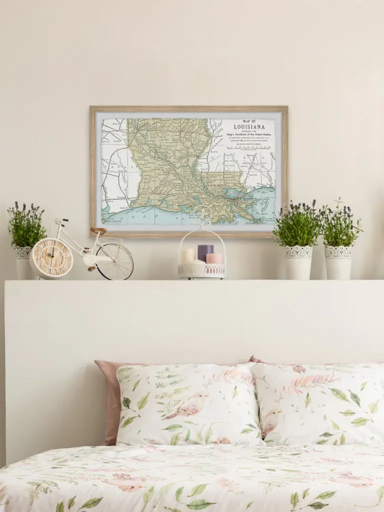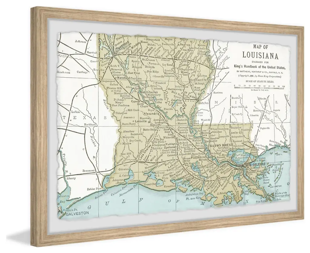 This beige and blue map features the entire state of Louisiana and its bordering states. Proudly printed in the USA, this piece is printed on high quality archive paper and professionally hand-framed. With wall-mounting hooks included, this artful accent is ready to hang up as soon as it reaches your front door.- Top quality Gicle print on high resolution Archive Paper- Hand cut deckled edges- High quality durable non-warping frame- Finished under shatter resistant plexiglass- Arrives ready to hang- Includes a certificate of authenticity- Printed in the USA