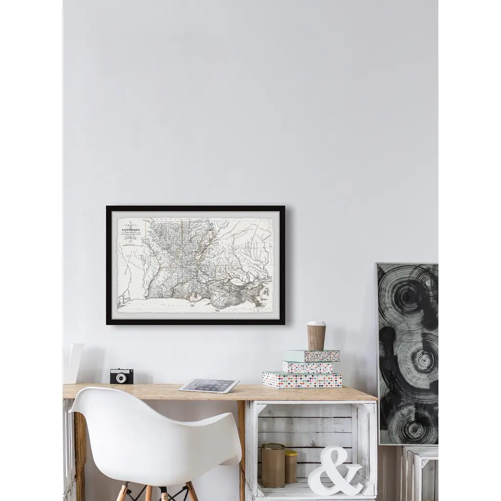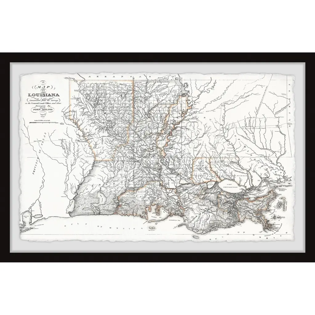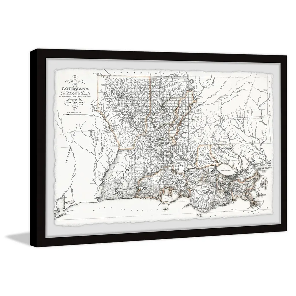 This print features a map of the entire state of Louisiana and all that it has to offer. Proudly printed in the USA, this piece is printed on high quality archive paper and professionally hand-framed. With wall-mounting hooks included, this artful accent is ready to hang up as soon as it reaches your front door. • Top quality Giclee print on high resolution Archive Paper • Hand cut deckled edges • High quality durable non-warping frame • Finished under shatter resistant plexiglass • Arrives ready to hang • Includes a certificate of authenticity • Printed in the USA