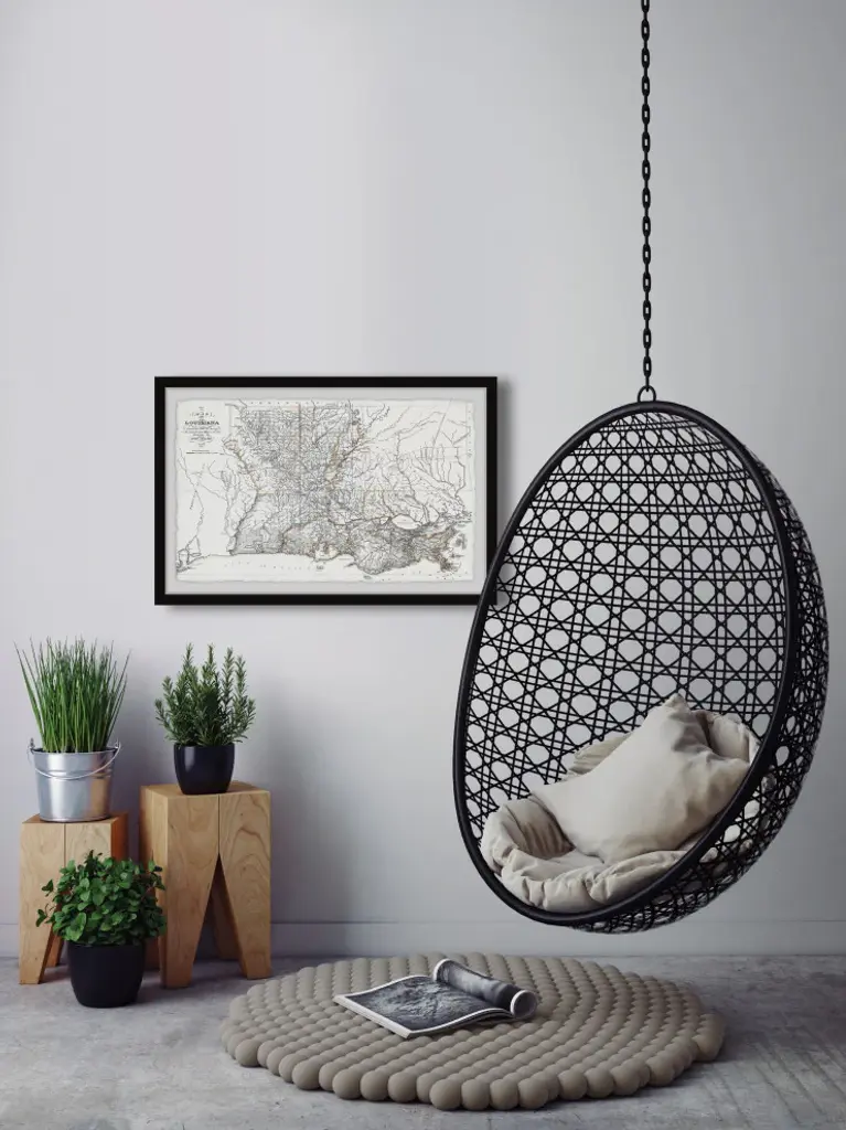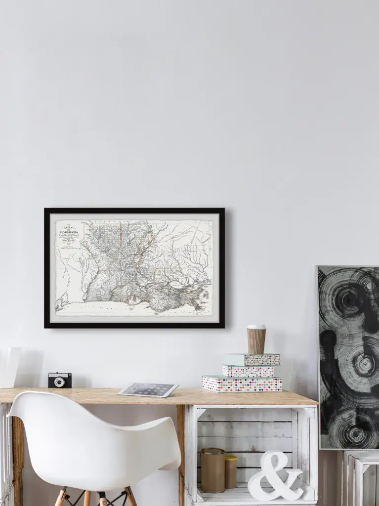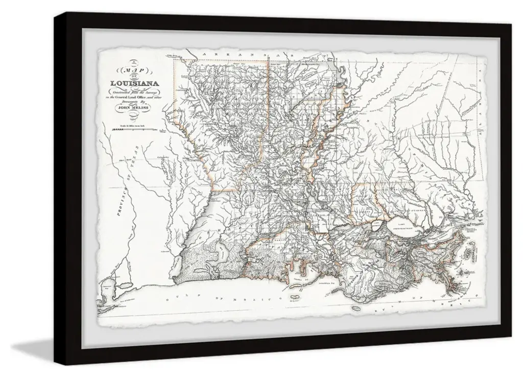 This print features a map of the entire state of Louisiana and all that it has to offer. Proudly printed in the USA, this piece is printed on high quality archive paper and professionally hand-framed. With wall-mounting hooks included, this artful accent is ready to hang up as soon as it reaches your front door.- Top quality Gicle print on high resolution Archive Paper- Hand cut deckled edges- High quality durable non-warping frame- Finished under shatter resistant plexiglass- Arrives ready to hang- Includes a certificate of authenticity- Printed in the USA