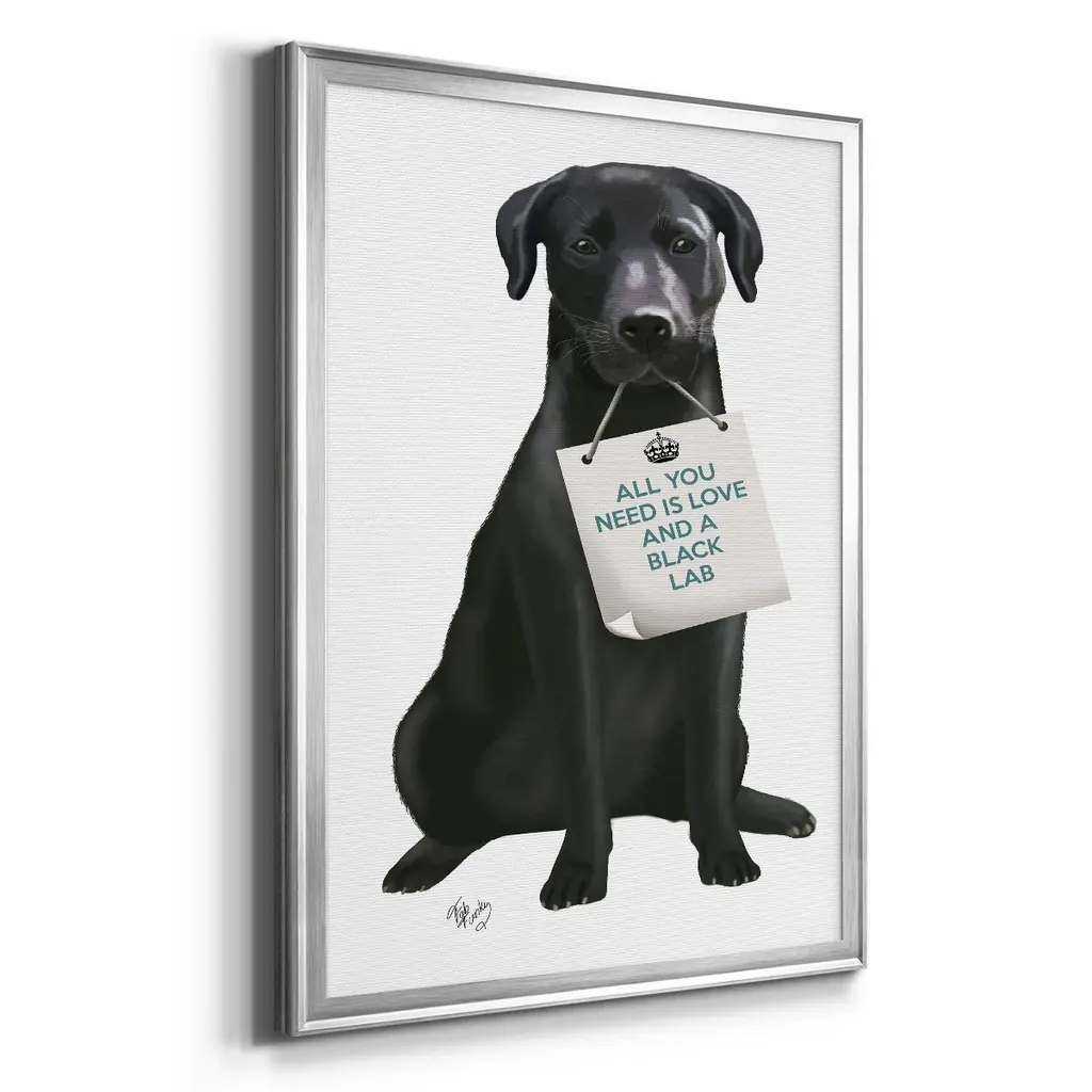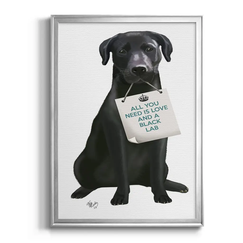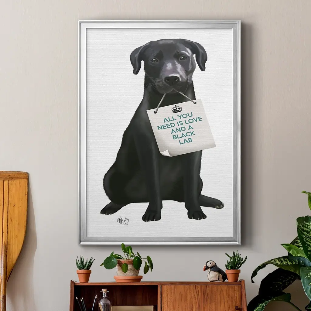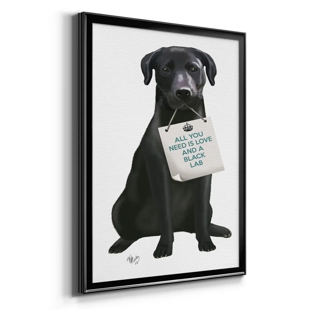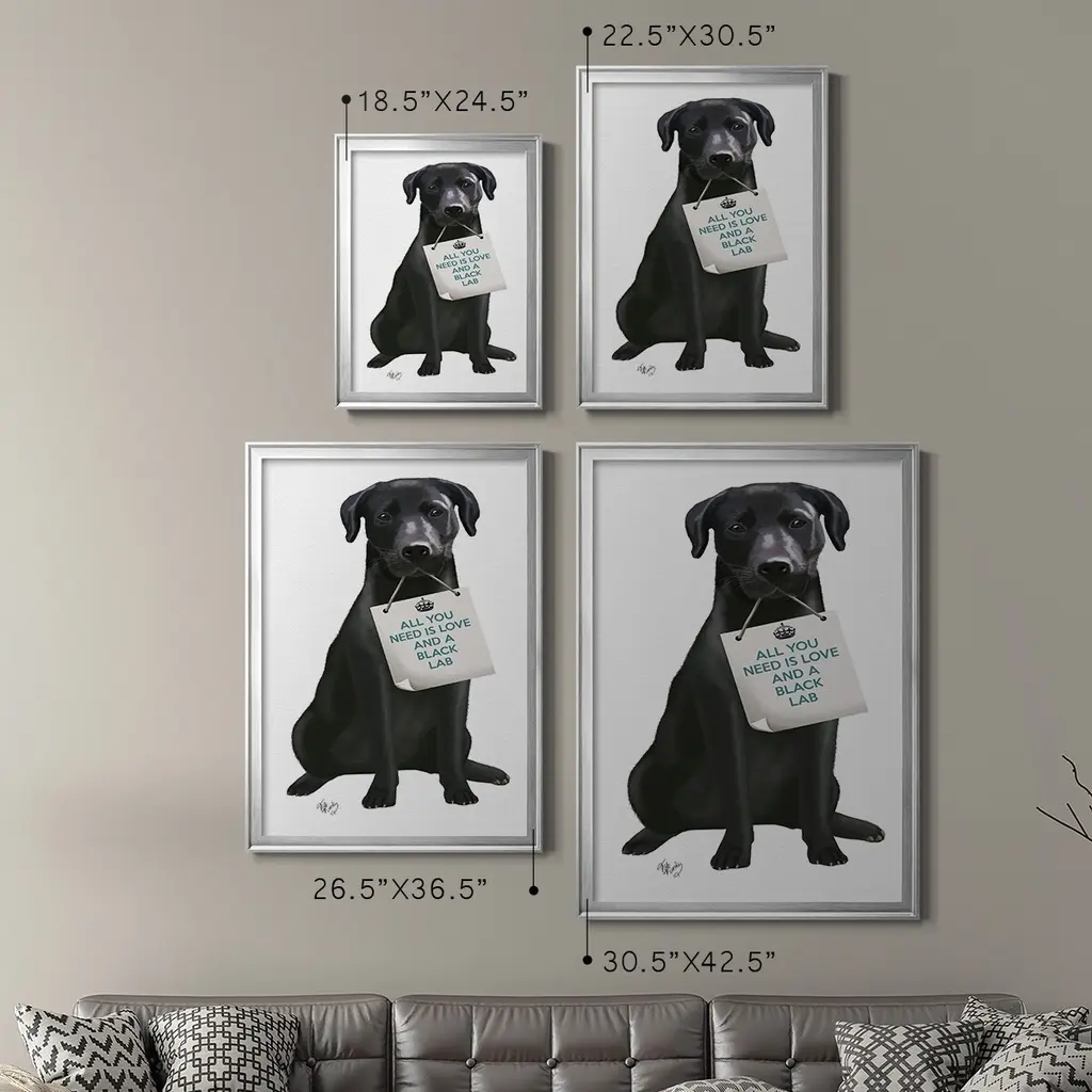 Love and Black Labrador Premium Framed Print - Ready to Hang A Premium Framed Print created to last. Framed in distressed wood and available in an array of sizes and colors Featuring a beveled a solid wood stretcher bar, each piece comes ready to hand 4 SIZES AVAILABLE 30.5''X42.5'' - Overall Size 26.5'X36.5'' - Overall Size 22.5''x30.5'' - Overall Size 18.5''x24.5'' - Overall Size Each piece is made to order. Each piece comes with hanging hardware. Made in the USA Ready to Hang